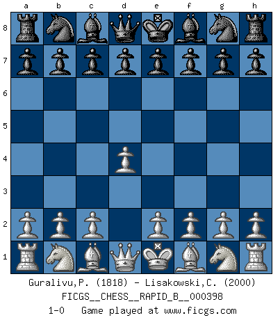 Last move : 1-0 2024 November 24 1:29:59 [Event "FICGS__CHESS__RAPID_B__000398"] [Site "FICGS"] [Date "2024.10.08"] [Round "1"] [White "Guralivu,Paul"] [Black "Lisakowski,Christof"] [Result "1-0"] [WhiteElo "1818"] [BlackElo "2000"] 1.d4 1-0 This chess game has been lost on time (started : 2024.10.08 20:10:4) Follow this game move after move (download)The Chess pieces are the block alphabet which shapes thoughts; and these thoughts, although making a visual design on the chessboard, express their beauty abstractly, like a poem. (Marcel Duchamp) Mein Gehirn das ist mein zweitwichtigstes Organ [Aus dem Film: Der Schläfer]. (Woody Allen) Si tu oponente no puede hacer nada activo, entonces no apures la posición; En vez de eso, dejalo estar sentado ahí, sufriendo y rogandote por un empate. (Jeremy Silman) Toutes les manuvres exécutées sur une colonne ouverte ont pour but ultime l'intrusion définitive sur la septième ou la huitième rangée, en plein cur de la position ennemie. (Aaron Nimzovitch) If you ain't just a little scared when you enter a casino, you are either very rich or you haven't studied the games enough. (Pappy)