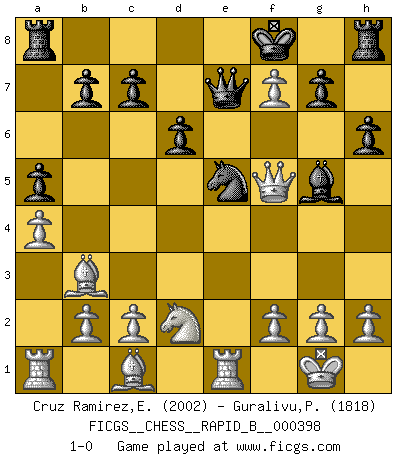 Last move : 1-0 2024 November 29 11:30:56 [Event "FICGS__CHESS__RAPID_B__000398"] [Site "FICGS"] [Date "2024.10.08"] [Round "1"] [White "Cruz Ramirez,Eliecer"] [Black "Guralivu,Paul"] [Result "1-0"] [WhiteElo "2002"] [BlackElo "1818"] 1.e4 e5 2.Nf3 Nc6 3.Bc4 h6 4.d4 exd4 5.O-O d6 6.Nxd4 Nxd4 7.Qxd4 Nf6 8.e5 Ng4 9.Re1 Be7 10.e6 Ne5 11.exf7+ Kf8 12.Bb3 Bf6 13.Nd2 a5 14.a4 Bf5 15.Qe3 Qe7 16.Qg3 Bh4 17.Qf4 Bg5 18.Qxf5 1-0 Follow this game move after move (download)When you don't know what to play, wait for an idea to come into your opponent's mind. You may be sure that idea will be wrong. (Siegbert Tarrasch) Du kannst im Schach nur gut werden, wenn du das Spiel liebst. (Robert James Fischer) Fischer era un maestro de claridad y un Rey del posicionamiento astuto. Sus oponentes podían ver hacia donde se dirigía pero eran impotentes para detenerlo. (Bruce Pandolfini) Il n'y a pas de prix trop élevé au scalp de l'ennemi. (Koblentz) Art is the triumph over chaos. (John Cheever)