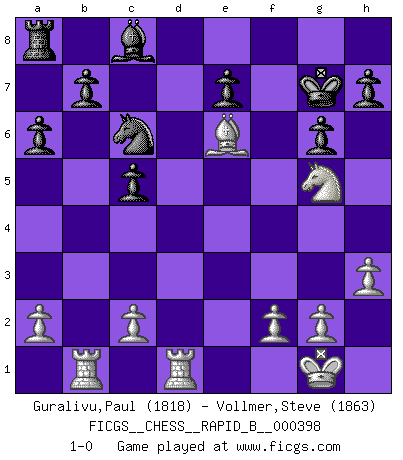 Last move : 1-0 2025 January 5 10:17:34 [Event "FICGS__CHESS__RAPID_B__000398"] [Site "FICGS"] [Date "2024.10.08"] [Round "1"] [White "Guralivu,Paul"] [Black "Vollmer,Steve"] [Result "1-0"] [WhiteElo "1818"] [BlackElo "1863"] 1.e4 Nf6 2.Nc3 d6 3.d4 g6 4.Nf3 Bg7 5.Be3 O-O 6.Bd3 c5 7.dxc5 dxc5 8.O-O Qc7 9.h3 a6 10.e5 Nfd7 11.Nd5 Qd8 12.e6 fxe6 13.Nf4 Rxf4 14.Bxf4 Bxb2 15.Rb1 Bg7 16.Bc4 Nc6 17.Bxe6+ Kh8 18.Ng5 Nde5 19.Bxe5 Qxd1 20.Bxg7+ Kxg7 21.Rfxd1 1-0 Follow this game move after move (download)During a Chess competition a Chessmaster should be a combination of a beast of prey and a monk. (Alexander Alekhine) Ich habe kein Problem mit Frauen, sondern nur mit dem Niveau ihres Schachspiels (Judith Polgar) El Ajedrez detiene a su maestro dentro de sus propios vínculos, encadenando la mente y el cerebro, por lo que la libertad interior del mas fuerte debe sufrir. (Albert Einstein) Le génie consiste à savoir transgresser les règles au moment opportun. (Teichmann) The project of the man are lower than those of the sky. (Chinese proverb)
