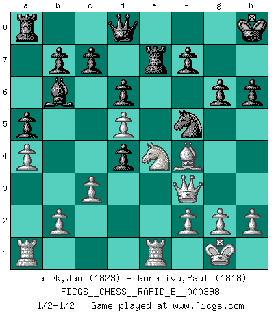 Last move : 1/2-1/2 2024 December 6 0:13:32 [Event "FICGS__CHESS__RAPID_B__000398"] [Site "FICGS"] [Date "2024.10.08"] [Round "1"] [White "Talek,Jan"] [Black "Guralivu,Paul"] [Result "1/2-1/2"] [WhiteElo "1823"] [BlackElo "1818"] 1.a4 e5 2.e4 Nf6 3.Nc3 Nc6 4.Nf3 Bb4 5.Bd3 O-O 6.O-O d6 7.Nd5 Bc5 8.c3 a5 9.Bc2 Nxd5 10.exd5 Ne7 11.Ng5 Bf5 12.Bxf5 Nxf5 13.Qh5 h6 14.Ne4 Qd7 15.d4 exd4 16.Qg4 Qc8 17.Re1 Bb6 18.Nf6+ Kh8 19.Qh5 g6 20.Qf3 Qd8 21.Ne4 Re8 22.Bd2 Re5 23.Bf4 Re7 1/2-1/2 Follow this game move after move (download)The winner of the game is the player who makes the next-to-last mistake. (Savielly Tartakover) Ich las kürzlich ein Buch von Nietzsche. Er sagte Religion verdumme nur die Menschen. Ich stimme zu. (Robert James Fischer) Cuando tu no sabes absolutamente que mas hacer, es tiempo de entrar en pánico. (John van der Wiel) Même un GMI sait rarement calculer sur plus de cinq coups une attaque à sacrifices. (Rudolf Spielmann) There is a great deal of difference between an eager man who wants to read a book and a tired man who wants a book to read. (G.K. Chesterton)