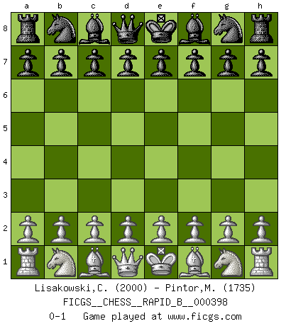 Last move : 0-1 2024 November 7 23:10:34 [Event "FICGS__CHESS__RAPID_B__000398"] [Site "FICGS"] [Date "2024.10.08"] [Round "1"] [White "Lisakowski,Christof"] [Black "Pintor,Manuel"] [Result "0-1"] [WhiteElo "2000"] [BlackElo "1735"] 0-1 This chess game has been lost on time (started : 2024.10.08 20:10:4) Follow this game move after move (download)I still hope to kill Fischer. (Boris Spassky) Schach ist gnadenlos. Du mußt bereit sein zu töten. (Nigel Short) Cada Peón es una Reina en potencia. (James Mason) Botvinnik disait en comparant les échecs à la musique: Il existe une science dont le but est l'étude de l'acoustique et des sons. Mais il y a aussi un art qui se sert de l'océan des sons : c'est la musique. De toute évidence, il en est de même pour la pensée. La logique est l'étude des lois de la réflexion et les échecs reflètent, en tant qu'art, le côté logique de la réflexion, sous la forme d'images artistiques... Extrait de Fischer - Spassky, Reykjavik 1972 par Alexander & F. Wyndham (Ed. Solar), p 37. Programmer - an organism that turns coffee into software. (Anonymous)