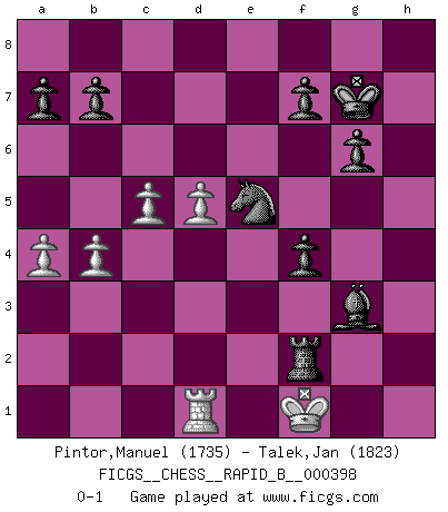 Last move : 0-1 2024 November 26 1:9:13 [Event "FICGS__CHESS__RAPID_B__000398"] [Site "FICGS"] [Date "2024.10.08"] [Round "1"] [White "Pintor,Manuel"] [Black "Talek,Jan"] [Result "0-1"] [WhiteElo "1735"] [BlackElo "1823"] 1.e4 c6 2.f4 d5 3.exd5 cxd5 4.d4 Nc6 5.Nf3 Bf5 6.Bd3 e6 7.O-O Nf6 8.Nc3 Rc8 9.Ne2 Bd6 10.Bxf5 exf5 11.Ng3 g6 12.c3 h5 13.h4 O-O 14.Ne5 Ng4 15.Nf3 Qc7 16.Ne5 Qe7 17.Nf3 Ne3 18.Bxe3 Qxe3+ 19.Kh1 Qxf4 20.Ne2 Qg4 21.Qe1 Rce8 22.Qd2 Re4 23.Rae1 Rfe8 24.Neg1 Bf4 25.Rxe4 dxe4 26.Qe2 Kg7 27.b4 exf3 28.Qxf3 Bg3 29.Qxg4 hxg4 30.a4 Bxh4 31.Kh2 Re3 32.Rc1 Bg3+ 33.Kh1 Re8 34.d5 Rh8+ 35.Nh3 Ne5 36.c4 f4 37.c5 gxh3 38.Rd1 hxg2+ 39.Kxg2 Rh2+ 40.Kf1 Rf2+ 0-1 Follow this game move after move (download)Chess is a terrible game. If you have no center, your opponent has a freer position. If you do have a center, then you really have something to worry about ! (Siegbert Tarrasch) Die Idee von Capablanca, Schach als Fach in den Schulen zu lehren, ist großartig. (Fidel Castro) Bendita sea la memoria de aquel que dio al mundo este juego inmortal. (A. G. Gardiner) On a dit que l'homme se distingue de l'animal par le fait qu'il achète plus de livres qu'il ne peut en lire. Je voudrais suggérer qu'inclure à la liste des livres quelques livres d'échecs rendrait la distinction manifeste. (Edward Lasker) Always remember that you are unique; just like everyone else. (Unknown)