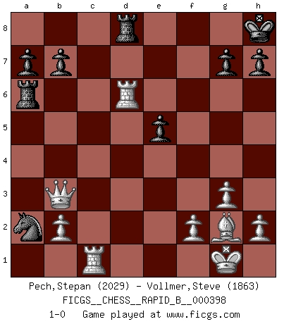 Last move : 1-0 2025 February 2 1:6:55 [Event "FICGS__CHESS__RAPID_B__000398"] [Site "FICGS"] [Date "2024.10.08"] [Round "1"] [White "Pech,Stepan"] [Black "Vollmer,Steve"] [Result "1-0"] [WhiteElo "2029"] [BlackElo "1863"] 1.c4 c5 2.Nc3 Nf6 3.Nf3 Nc6 4.g3 e6 5.Bg2 d5 6.cxd5 exd5 7.d4 Be6 8.O-O Be7 9.dxc5 Bxc5 10.Bg5 Be7 11.Nd4 O-O 12.Rc1 Rc8 13.Nxe6 fxe6 14.Bh3 Qd7 15.e4 Rcd8 16.Bxf6 Rxf6 17.exd5 Qe8 18.Re1 e5 19.Bg2 Qg6 20.Qa4 Nb4 21.Ne4 Ra6 22.Qb3 Kh8 23.d6 Bxd6 24.Nxd6 Qxd6 25.Red1 Nxa2 26.Rxd6 1-0 Follow this game move after move (download)There just isn't enough televised Chess. (David Letterman) Ein Schachgenie ist jemand der verdammt gut Schach spielt. (Jonathan Levitt) Por tratar de evitar la pérdida de una pieza, muchas personas han perdido una partida de Ajedrez. (Savielly Tartakover) C'est une question de caractère, Beaucoup de gens perdent leur motivation très vite. D'autres, ils sont rares, peuvent la conserver très longtemps. J'aime les échecs, encore aujourd'hui je suis heureux d'analyser des parties. J'aime toujours gagner, je déteste encore perdre. Bien jouer est important pour mon intégrité intellectuelle et morale. Et puis les échecs vivent en ce moment une période historique grâce à Internet. Ils se développent dans les systèmes éducatifs à travers le monde. Ils sortent de leur ghetto, et c'est mon rôle de mener à bien cette révolution. (Gary Kasparov) Life is pleasant. Death is peaceful. It's the transition that's troublesome. (Isaac Asimov)