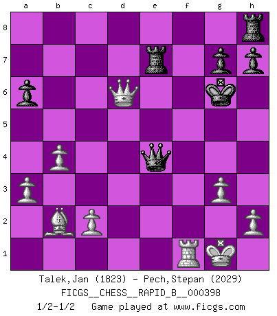 Last move : 1/2-1/2 2025 January 2 22:31:4 [Event "FICGS__CHESS__RAPID_B__000398"] [Site "FICGS"] [Date "2024.10.08"] [Round "1"] [White "Talek,Jan"] [Black "Pech,Stepan"] [Result "1/2-1/2"] [WhiteElo "1823"] [BlackElo "2029"] 1.b3 e5 2.Bb2 Nc6 3.e3 d5 4.Bb5 Bd6 5.f4 Qh4+ 6.g3 Qe7 7.Nf3 f6 8.Nc3 Be6 9.fxe5 fxe5 10.d4 e4 11.Ne5 Qg5 12.Nxc6 a6 13.Ba4 Nf6 14.Ne5 c6 15.b4 Qxe3+ 16.Qe2 Qxd4 17.Nxc6 bxc6 18.Bxc6+ Kf7 19.a3 Rac8 20.Rd1 Qe5 21.Rxd5 Bxd5 22.Bxd5+ Kg6 23.Bxe4+ Nxe4 24.Nxe4 Qe6 25.Qd3 Rce8 26.O-O Qxe4 27.Qxd6+ Re6 28.Qd7 Re7 29.Qd6+ Re6 30.Qd7 Re7 31.Qd6+ Re6 32.Qc7 Re7 33.Qd6+ 1/2-1/2 Follow this game move after move (download)Robert Fischer is a law unto himself. (Larry Evans) Man gibt nur Pakete auf. (Paul Keres) Alekhine es un poeta que crea un trabajo de arte de algo que raramente inspiraría a otra persona a mandar una tarjeta postal. (Max Euwe) Si je n'étais pas joueur d'échecs, je serais le meilleur dans quelque chose d'autre. (Anatoli Karpov) Information on the Internet is subject to the same rules and regulations as conversation at a bar. (George Lundberg)