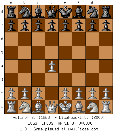 Last move : 1-0 2024 November 7 23:10:34 [Event "FICGS__CHESS__RAPID_B__000398"] [Site "FICGS"] [Date "2024.10.08"] [Round "1"] [White "Vollmer,Steve"] [Black "Lisakowski,Christof"] [Result "1-0"] [WhiteElo "1863"] [BlackElo "2000"] 1.d4 1-0 This chess game has been lost on time (started : 2024.10.08 20:10:4) Follow this game move after move (download)If Chess is a science, it's a most inexact one. If Chess is an art, it is too exacting to be seen as one. If Chess is a sport, it's too esoteric. If Chess is a game, it's too demanding to be just a game. If Chess is a mistress, she's a demanding one. If Chess is a passion, it's a rewarding one. If Chess is life, it's a sad one. (Unknown) Mutter, ich bin eben Ex-Weltmeister geworden. --beim nach Hause Kommen nach dem Verlust des WM-Titels an Mihail Botvinnik -- (Mikhail Nekhemyevich Tal) El jugador táctico debe saber que hacer cuando algo se debe de hacer. El estratégico debe saber que hacer cuando nada se debe de hacer. (Savielly Tartakover) Une platitude souvent récitée à propos des Echecs est qu'une des choses les plus difficiles à réaliser est de gagner une position gagnante. Cela ne manque pas de sens mais, pour ma part, j'ai toujours trouvé plus difficile de gagner une position perdante. (Tim Krabbe) Wipe them out. All of them. (Darth Sidious in Star Wars ep.1)