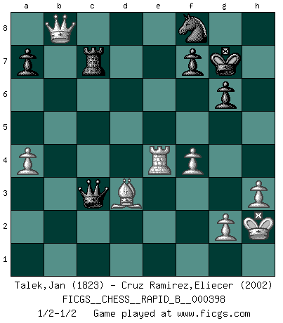 Last move : 1/2-1/2 2024 November 25 23:35:27 [Event "FICGS__CHESS__RAPID_B__000398"] [Site "FICGS"] [Date "2024.10.08"] [Round "1"] [White "Talek,Jan"] [Black "Cruz Ramirez,Eliecer"] [Result "1/2-1/2"] [WhiteElo "1823"] [BlackElo "2002"] 1.b4 e5 2.Bb2 Bxb4 3.Bxe5 Nf6 4.e3 d5 5.c3 Bd6 6.Bxd6 Qxd6 7.d4 c5 8.Bd3 Nc6 9.a4 Bg4 10.Ne2 O-O 11.O-O Rfc8 12.h3 Bh5 13.Nd2 b6 14.Re1 Rc7 15.Qb1 Bg6 16.Nf4 Rac8 17.Nxg6 hxg6 18.Qb2 Qd7 19.dxc5 bxc5 20.Bb5 c4 21.e4 Qd6 22.Rad1 Ne5 23.exd5 Qxd5 24.Qa2 Rd8 25.Qc2 Qc5 26.Ne4 Qe7 27.Ng5 Rd3 28.Rxd3 cxd3 29.Bxd3 Nh7 30.f4 Qc5+ 31.Kh2 Qxc3 32.Qb1 Nxg5 33.Rxe5 Ne6 34.Bxg6 Nf8 35.Bd3 g6 36.Re3 Qf6 37.Re4 Kg7 38.Qb8 Qc3 1/2-1/2 Follow this game move after move (download)It is the aim of the modern school, not to treat every position according to one general law, but according to the principle inherent in the position. (Richard Reti) Wer sich die Fähigkeit anerziehen will im Schach selbstständig zu denken, der muß alles meiden, was leblos ist: ausgeklügelte Theorien, die sich auf sehr wenige Beispiele und eine Menge Hirngespinste stützen. (Emanuel Lasker) Bobby es la celebridad menos entendida y malinterpretada que camina el la faz de esta tierra. (Yasser Seirawan) Il s'avisa de me proposer d'apprendre les échecs qu'il jouait un peu... me voilà forcené des échecs. J'achète un échiquier, je m'enferme dans ma chambre, j'y passe des jours et des nuits à vouloir apprendre par cur toutes les parties. (Jean-Jacques Rousseau, Confessions) Whoever said the pen is mightier than the sword obviously never encountered automatic weapons. (US General Douglas MacArthur)