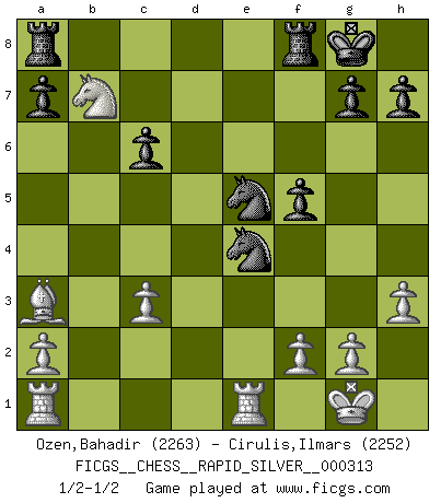 Last move : 1/2-1/2 2024 October 14 14:48:59 [Event "FICGS__CHESS__RAPID_SILVER__000313"] [Site "FICGS"] [Date "2024.10.09"] [Round "1"] [White "Ozen,Bahadir"] [Black "Cirulis,Ilmars"] [Result "1/2-1/2"] [WhiteElo "2263"] [BlackElo "2252"] 1.d4 d5 2.c4 c6 3.Nf3 Nf6 4.Nc3 e6 5.e3 Bd6 6.Bd3 dxc4 7.Bxc4 b5 8.Bd3 Nbd7 9.Qc2 Bb7 10.O-O O-O 11.e4 e5 12.h3 exd4 13.Nxd4 b4 14.Nf5 bxc3 15.Nxd6 Ne5 16.Nxb7 Qxd3 17.Qxc3 Qxc3 18.bxc3 Nxe4 19.Re1 f5 20.Ba3 1/2-1/2 Follow this game move after move (download)Fischer is the strongest player in the world. In fact, the strongest player who ever lived. (Larry Evans) Sie führen leise Selbstgespräche, schlürfen lautstark ihre Getränke, schmatzen hörbar beim Essen, blasen ihrem Gegenüber Rauch in die Augen, niesen ihm ins Gesicht, starren ihn unverwandt an, bis er sich unter ihren Blicken windet, rutschen ständig auf ihrem Stuhl hin und her, rülpsen und bohren in der Nase. (Anonymous) Dios mío, Bobby Fischer juega tan simple. (Alexei Suetin) Les Echecs sont et restent toujours un combat, un combat intégral comme la boxe, la lutte ou un autre sport, et où il doit y avoir un vainqueur et un vaincu. (Joseph Emil Diemer) Question: Is 'This statement is paradoxical' a paradoxical statement ? Or is it a meta-paradox ? (Normajean Yates)