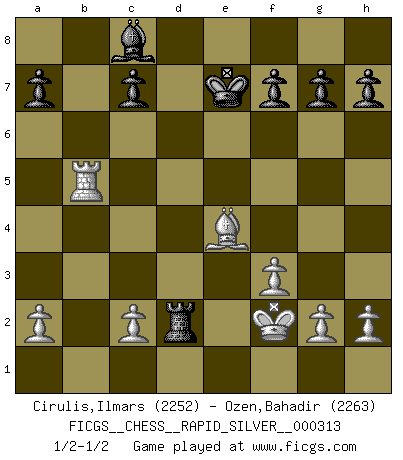 Last move : 1/2-1/2 2024 October 14 14:46:50 [Event "FICGS__CHESS__RAPID_SILVER__000313"] [Site "FICGS"] [Date "2024.10.09"] [Round "2"] [White "Cirulis,Ilmars"] [Black "Ozen,Bahadir"] [Result "1/2-1/2"] [WhiteElo "2252"] [BlackElo "2263"] 1.e4 e5 2.Nf3 Nc6 3.d4 exd4 4.Nxd4 Nf6 5.Nc3 Bb4 6.Nxc6 bxc6 7.Bd2 d5 8.Bd3 O-O 9.O-O Bxc3 10.Bxc3 dxe4 11.Bxf6 Qxf6 12.Bxe4 Qxb2 13.Bxc6 Rb8 14.Rb1 Qxb1 15.Qxb1 Rxb1 16.Rxb1 Rd8 17.f3 Kf8 18.Be4 Ke7 19.Rb5 Rd1+ 20.Kf2 Rd2+ 1/2-1/2 Follow this game move after move (download)The mistakes are there, waiting to be made. (Savielly Tartakower) Nicht daß Diemer aus Opportunismus Mitglied der NSDAP geworden wäre. Er war ein Fanatiker, in allem, was er tat. (Hans Ree) Los Peones son nacidos libres, y aún así, se encuentran por doquier encadenados. (Rick Kennedy) Les échecs, c'est la lutte contre l'erreur. (Johannes Zukertort) Every now and then a man's mind is stretched by a new idea and never shrinks back to its former dimensions. (Oliver Wendell Holmes, Sr.)