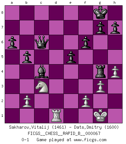 Last move : 0-1 2007 October 15 20:0:17 [Event "FICGS__CHESS__RAPID_B__000067"] [Site "FICGS"] [Date "2007.09.21"] [Round "1"] [White "Sakharov,Vitalij"] [Black "Dats,Dmitry"] [Result "0-1"] [WhiteElo "1461"] [BlackElo "1600"] 1.e4 e5 2.Nf3 Nc6 3.Bb5 a6 4.Ba4 Nf6 5.O-O Be7 6.Re1 b5 7.Bb3 O-O 8.d4 d6 9.Bd5 Nxd5 10.exd5 Nxd4 11.Nxd4 exd4 12.Qxd4 Re8 13.a3 Bf6 14.Rxe8+ Qxe8 15.Qd1 Bf5 16.a4 Bxc2 17.Qf1 Bxa4 18.g3 Bb3 19.Nc3 Bc4 20.Qd1 c6 21.dxc6 Qxc6 22.Bf4 Be5 23.Bxe5 dxe5 24.Qg4 Rd8 25.Re1 f6 26.h4 Rd4 27.Rd1 Rxg4 0-1 Ruy Lopez : Closed, 7...O-O Kingside Castling by player White (move 5) Kingside Castling by player Black (move 7) Player Black won this chess game. Follow this game move after move (download)There just isn't enough televised Chess. (David Letterman) Der 70jährige Viktor Kortschnoi: Die Rentenanstalt wollte mich zwingen in Rente zu gehen. Meine Frau erhält jetzt eine Pension- und ich zahle weiter in die Rentenkasse ein! (Viktor Kortschnoi) No es suficiente ser un buen jugador, se debe también de jugar bién. (Siegbert Tarrasch) Le plus grand jeu de l'esprit jamais inventé, plus vous l'apprenez, plus vous y prenez du plaisir. (Garry Kasparov) You cannot beat a roulette table unless you steal money from it. (Albert Einstein)