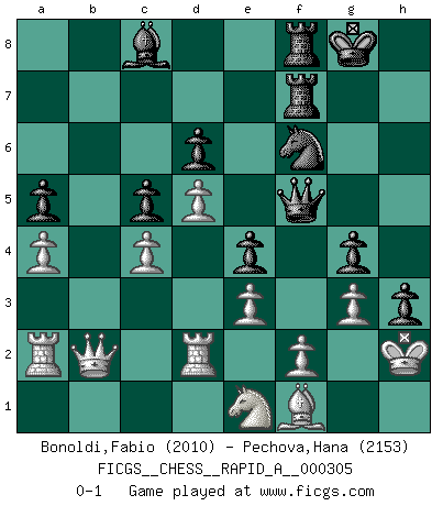 Last move : 0-1 2025 March 15 19:42:17 [Event "FICGS__CHESS__RAPID_A__000305"] [Site "FICGS"] [Date "2024.10.12"] [Round "1"] [White "Bonoldi,Fabio"] [Black "Pechova,Hana"] [Result "0-1"] [WhiteElo "2010"] [BlackElo "2153"] 1.b3 e5 2.Bb2 d6 3.e3 Nf6 4.Nf3 g6 5.c4 Bg7 6.Be2 O-O 7.O-O Re8 8.d3 Nbd7 9.Nbd2 Qe7 10.Qc2 b6 11.b4 Bb7 12.a3 h6 13.h3 Nh7 14.Rac1 Rad8 15.Ne4 f5 16.Nc3 c6 17.Rfd1 h5 18.d4 e4 19.Ne1 Ndf6 20.d5 c5 21.Nb5 Bc8 22.Qd2 a6 23.Nc3 g5 24.Na4 Nd7 25.Bxg7 Qxg7 26.Rb1 h4 27.bxc5 bxc5 28.Nb6 Nxb6 29.Rxb6 g4 30.Kh1 Kh8 31.hxg4 fxg4 32.g3 h3 33.Kg1 Ng5 34.Bf1 Rf8 35.Qc1 Rf6 36.Rd2 Rdf8 37.R6b2 R6f7 38.Ra2 a5 39.Rab2 Kg8 40.Ra2 Qe5 41.Kh2 Nh7 42.Qb2 Qf5 43.a4 Nf6 0-1 Follow this game move after move (download)Chess is a sea in which a gnat may drink and an elephant may bathe. (Hindu proverb) Über Frauen: Chess is better. (Robert James Fischer) Un entendimiento minucioso de las típicas continuaciones de mate hacen de las mas complicadas combinaciones de sacrificio que conducen hacia ellas no solo no dificiles, sino casi un asunto de rutina. (Siegbert Tarrasch) Mais l'homme est une créature légère et illogique : semblable au joueur d'échecs, il n'aime que le processus du but à atteindre, non le but lui-même. (Dostoïevsky) If you don't practice you don't deserve to win. (Andre Agassi)