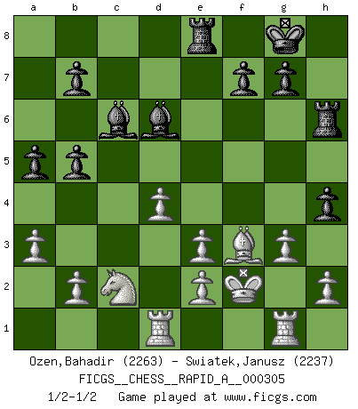 Last move : 1/2-1/2 2024 December 3 21:43:4 [Event "FICGS__CHESS__RAPID_A__000305"] [Site "FICGS"] [Date "2024.10.12"] [Round "1"] [White "Ozen,Bahadir"] [Black "Swiatek,Janusz"] [Result "1/2-1/2"] [WhiteElo "2263"] [BlackElo "2237"] 1.c4 e5 2.g3 Nf6 3.Bg2 d5 4.cxd5 Nxd5 5.Nc3 Nb6 6.Nf3 Nc6 7.O-O Be7 8.d3 Be6 9.a3 a5 10.Be3 O-O 11.Na4 Re8 12.Nxb6 cxb6 13.Qa4 Bd7 14.Qc4 h6 15.Qd5 b5 16.Rfd1 Bf8 17.d4 Ne7 18.Qxe5 Nf5 19.Qd5 Nxe3 20.fxe3 Bc6 21.Qxd8 Raxd8 22.Kf2 Rd6 23.Ne1 Rf6+ 24.Bf3 Bd6 25.Nc2 h5 26.Rf1 h4 27.Rad1 Rh6 28.Rg1 1/2-1/2 Follow this game move after move (download)Pawns are born free, yet they are everywhere in chains. (Rick Kennedy) Vom Schach wurde gesagt das Leben sei dafür nicht lange genug. Aber das ist der Fehler des Lebens, nicht des Schach'. (Irving Chernev) Durante una competencia de Ajedrez, un Maestro de Ajedrez deberá ser una combinación de presa de caza y un Monge. (Alexander Alekhine) J'ai vu le vaincu d'Echecs jouer des années durant dans l'espoir de la fête de la victoire. Car tu es plus riche de ce qu'elle existe si même elle n'est point pour toi. Ainsi de la perle du fond des mers. (Antoine de Saint-Exupéry) Man is still the most extraordinary computer of all. (John F. Kennedy)