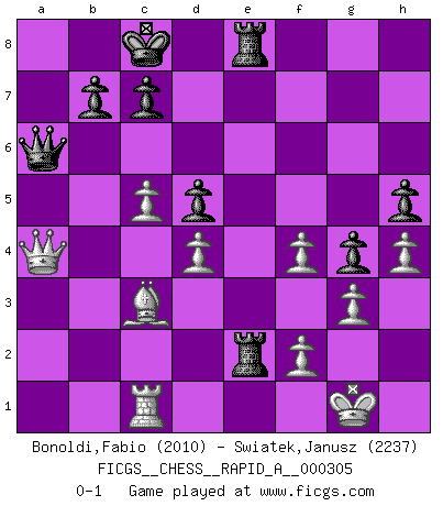 Last move : 0-1 2025 February 8 19:57:46 [Event "FICGS__CHESS__RAPID_A__000305"] [Site "FICGS"] [Date "2024.10.12"] [Round "1"] [White "Bonoldi,Fabio"] [Black "Swiatek,Janusz"] [Result "0-1"] [WhiteElo "2010"] [BlackElo "2237"] 1.b3 e5 2.Bb2 Nc6 3.e3 d5 4.Bb5 Nge7 5.Bxe5 a6 6.Bxc6+ Nxc6 7.Bb2 Qg5 8.Kf1 Bg4 9.Ne2 O-O-O 10.d4 h5 11.h3 Bf5 12.Nd2 Qf6 13.a3 g5 14.c4 Ne7 15.Rc1 g4 16.h4 Bh6 17.Kg1 Bg6 18.Ng3 Rhe8 19.c5 Qe6 20.Ndf1 f5 21.Ne2 f4 22.Nxf4 Bxf4 23.exf4 Nf5 24.Bc3 Qf6 25.Ng3 Re6 26.b4 Rf8 27.Nxf5 Bxf5 28.g3 Be4 29.Qb3 Rfe8 30.b5 axb5 31.a4 Bxh1 32.Kxh1 Re2 33.Kg1 bxa4 34.Qxa4 Qa6 0-1 Follow this game move after move (download)Fischer Chess play was always razor-sharp, rational and brilliant. One of the best ever. (Dave Regis) Konzentriere dich auf materielle Gewinne. Nimm, was dir dein Gegner gibt, ausser es gibt einen guten Grund der dagegenspricht. (Robert James Fischer) Combinaciones deslumbrantes son para la mayoría, mover madera es para los pocos. (Georg Kieninger) Les échecs sont utiles à l'exercice de la faculté de penser et à celle de l'imagination. Car nous devons posséder une méthode élaborée pour atteindre des buts partout où nous devons conduire notre raison. (Leibnitz) Always be a first-rate version of yourself, instead of a second-rate version of somebody else. (Judy Garland)