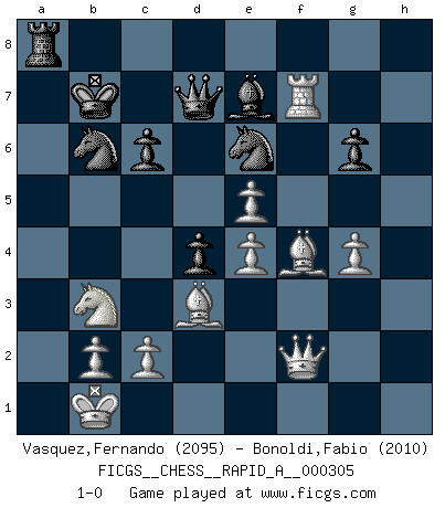 Last move : 1-0 2025 March 15 19:42:28 [Event "FICGS__CHESS__RAPID_A__000305"] [Site "FICGS"] [Date "2024.10.12"] [Round "1"] [White "Vasquez,Fernando"] [Black "Bonoldi,Fabio"] [Result "1-0"] [WhiteElo "2095"] [BlackElo "2010"] 1.e4 d6 2.d4 Nf6 3.Nc3 c6 4.Nf3 Bg4 5.h3 Bh5 6.Qe2 Bxf3 7.Qxf3 e6 8.d5 Nbd7 9.g4 g6 10.Bf4 e5 11.dxc6 bxc6 12.Be3 Nb6 13.O-O-O h5 14.Be2 Be7 15.Qg2 Qc7 16.Rhf1 hxg4 17.hxg4 O-O-O 18.Kb1 Nfd7 19.Qf3 Rdf8 20.Rh1 Rxh1 21.Rxh1 Kb7 22.a4 a5 23.Rh7 Nf6 24.Rg7 Qd8 25.Bd2 d5 26.Qd3 d4 27.Na2 Qa8 28.Bg5 Kc7 29.f4 Qe8 30.fxe5 Nfd7 31.Bf4 Nc5 32.Qd2 Kb7 33.Qxa5 Qd7 34.Nc1 Ra8 35.Qd2 Bf8 36.Rh7 Rxa4 37.Bd3 Ne6 38.Qf2 Ka8 39.Rh8 Kb7 40.Nb3 Ra8 41.Rh7 Be7 42.Rxf7 1-0 Follow this game move after move (download)Weak points or holes in the opponent's position must be occupied by pieces not Pawns. (Siegbert Tarrasch) Zu meiner Zeit war ein 20 jähriger ein junger Spieler, heute ist er ein Veteran. (Garry Kasparov) El Ajedrez es un juego de pelea el cual es puramente intelectual e incluye la suerte. (Richard Reti) Votre seul travail dans les ouvertures est d'obtenir un milieu de partie jouable. (Lajos Portish) It's not the will to win, but the will to prepare to win that makes the difference. (Bear Bryant)