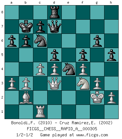 Last move : 1/2-1/2 2024 December 29 14:22:55 [Event "FICGS__CHESS__RAPID_A__000305"] [Site "FICGS"] [Date "2024.10.12"] [Round "1"] [White "Bonoldi,Fabio"] [Black "Cruz Ramirez,Eliecer"] [Result "1/2-1/2"] [WhiteElo "2010"] [BlackElo "2002"] 1.b3 e5 2.Bb2 Nc6 3.e3 d5 4.Bb5 Bd6 5.f4 Qh4+ 6.g3 Qe7 7.Nf3 f6 8.Nc3 Qf7 9.O-O exf4 10.exf4 Bh3 11.Re1+ Nge7 12.d4 O-O-O 13.Bf1 Bxf1 14.Rxf1 h5 15.Nb5 Nf5 16.Qd3 g6 17.Nxd6+ Nxd6 18.Rae1 Nb4 19.Qd2 Nc6 20.Qd3 Rhe8 21.c3 Rxe1 22.Rxe1 Ne4 23.Ba3 Qd7 24.c4 f5 25.Bb2 Nb4 26.Qe2 Nc6 27.Kg2 a6 28.Qd1 b6 29.a3 Kb7 30.Qc2 Qf7 31.Rc1 Qd7 32.Qd3 1/2-1/2 Follow this game move after move (download)An attack on the wing should be met by play in the center. (Nimzovitch) Frage: Wie viele Autos haben Sie schon zerstört? - Antwort: Nur zwei. (Loek van Wely) Un entendimiento minucioso de las típicas continuaciones de mate hacen de las mas complicadas combinaciones de sacrificio que conducen hacia ellas no solo no dificiles, sino casi un asunto de rutina. (Siegbert Tarrasch) C'est la seule position que je connaisse où les deux camps sont mals. Propos prêtés à V. Anand. The best teachers teach from the heart, not from the book. (Author unknown)