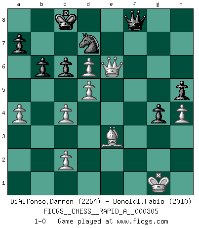 Last move : 1-0 2024 December 29 7:55:56 [Event "FICGS__CHESS__RAPID_A__000305"] [Site "FICGS"] [Date "2024.10.12"] [Round "1"] [White "DiAlfonso,Darren"] [Black "Bonoldi,Fabio"] [Result "1-0"] [WhiteElo "2264"] [BlackElo "2010"] 1.e4 d6 2.d4 Nf6 3.Nc3 c6 4.f4 Qa5 5.Bd3 e5 6.Nf3 Bg4 7.Be3 Nbd7 8.h3 exf4 9.Bxf4 Bh5 10.g4 Bg6 11.Qe2 O-O-O 12.O-O Re8 13.a4 Qd8 14.Rae1 d5 15.e5 Bb4 16.Qf2 Bxc3 17.bxc3 Ne4 18.Bxe4 Bxe4 19.Ng5 Rhf8 20.Rxe4 dxe4 21.Nxe4 Re6 22.Nd6+ Rxd6 23.exd6 f5 24.gxf5 Rxf5 25.Qe3 Rf8 26.Re1 Qf6 27.Bg3 g5 28.Re2 h5 29.Rf2 Qd8 30.Rxf8 Nxf8 31.Qe7 Nd7 32.Qe6 Qf8 33.Bf2 b6 34.c4 g4 35.h4 Kd8 36.Be3 Kc8 37.d5 1-0 Follow this game move after move (download)A Chess game is divided into three stages: the first, when you hope you have the advantage, the second when you believe you have an advantage, and the third... when you know you're going to lose ! (Savielly Tartakower) Man braucht nicht immer den besten Zug zu spielen: Ein Zug muß aktiv, unternehmungslustig, korrekt und schön sein. (David Bronstein) No todos los artistas son jugadores de Ajedrez, pero todos los jugadores de Ajedrez son artistas. (Marcel Duchamp) La tactique, c'est ce que vous faites quand il y a quelque chose à faire; la stratégie, c'est ce que vous faites quand il n'y a rien à faire. (Savielli Tartacower) Life is painting a picture, not doing a sum. (Oliver Wendell Holmes, Jr.)