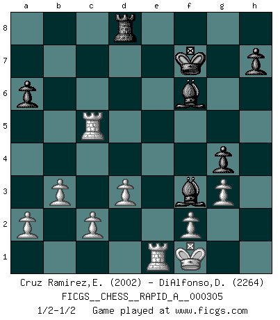 Last move : 1/2-1/2 2024 November 13 14:14:48 [Event "FICGS__CHESS__RAPID_A__000305"] [Site "FICGS"] [Date "2024.10.12"] [Round "1"] [White "Cruz Ramirez,Eliecer"] [Black "DiAlfonso,Darren"] [Result "1/2-1/2"] [WhiteElo "2002"] [BlackElo "2264"] 1.e4 e5 2.Nf3 Nc6 3.Bc4 Nf6 4.Ng5 d5 5.exd5 Na5 6.Bb5+ c6 7.dxc6 bxc6 8.Bd3 Nd5 9.Nf3 Bd6 10.O-O O-O 11.Re1 f5 12.Nxe5 Qf6 13.Nf3 g5 14.g3 f4 15.Nc3 fxg3 16.hxg3 Qxf3 17.Qxf3 Rxf3 18.Be4 Rf7 19.Nxd5 cxd5 20.Bxd5 Bb7 21.Bxf7+ Kxf7 22.b3 Nc6 23.Bb2 Nb4 24.Ba3 Rd8 25.Bxb4 Bxb4 26.Re5 Be7 27.Rae1 Bf6 28.Ra5 a6 29.Rc5 Bf3 30.d3 g4 31.Kf1 1/2-1/2 Follow this game move after move (download)Chess is as much a mystery as women. (Purdy) Drei Punkte vor allen anderen ist wie einer, der im weißen Anzug posiert, während der Rest in Müllsäcke gekleidet dasteht. (Viktor Kortschnoi) Ayuda a tus piezas para que ellas te puedan ayudar. (Paul Morphy) Les échecs sont un jeu par leur forme, un art par leur essence et une science par sa difficulté d'acquisition. Ils peuvent vous procurer autant de plaisir qu'un bon livre ou une belle musique, mais vous n'aurez une réelle joie que si vous arrivez à bien jouer. (Tigran Petrosian) Wisdom begins at the end. (Daniel Webster)