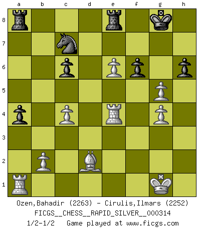 Last move : 1/2-1/2 2024 November 30 8:37:44 [Event "FICGS__CHESS__RAPID_SILVER__000314"] [Site "FICGS"] [Date "2024.10.14"] [Round "2"] [White "Ozen,Bahadir"] [Black "Cirulis,Ilmars"] [Result "1/2-1/2"] [WhiteElo "2263"] [BlackElo "2252"] 1.e4 e5 2.Nf3 Nc6 3.Bc4 Bc5 4.c3 Nf6 5.d3 O-O 6.O-O d5 7.exd5 Nxd5 8.a4 a5 9.Re1 Bg4 10.Nbd2 Nb6 11.Bb5 Bd6 12.Ne4 Na7 13.h3 Bh5 14.d4 Nxb5 15.axb5 exd4 16.Nxd6 Qxd6 17.Qxd4 Qd8 18.Qe4 Qd5 19.Qxd5 Nxd5 20.Nd4 Rfd8 21.Bd2 a4 22.f4 f6 23.Ne6 Re8 24.f5 Bf7 25.g4 c6 26.bxc6 bxc6 27.Re4 Bxe6 28.fxe6 g5 29.h4 h6 30.c4 Nc7 31.hxg5 1/2-1/2 Follow this game move after move (download)As one by one I mowed them down, my superiority soon became apparent. (Jose Capablanca) Bis jetzt ist Weiß einer wohlbekannten Analyse gefolgt. Aber jetzt begeht er einen schrecklichen Fehler: Er beginnt seinen eigenen Kopf zu benutzen. (Siegbert Tarrasch) Coloca el contenido del tablero de Ajedrez en un sombrero, agita las piezas vigorosamente, derrámalas en el tablero desde una altura de medio metro y así obtienes el estilo de Wilhelm Steinitz. (H. E. Bird) Toutes choses étant égales, c'est la conviction qui gagne. Alliée à une volonté de vaincre, elle sert de détonateur, suscite des idées, disperse les doutes et aide à penser clairement. (Robert Fischer) A journey of a thousand sites begins with a single click. (Author unknown)