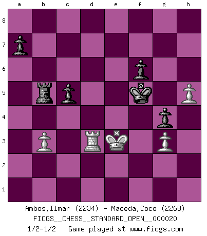 Last move : 1/2-1/2 2025 March 28 10:11:44 [Event "FICGS__CHESS__STANDARD_OPEN__000020"] [Site "FICGS"] [Date "2024.10.17"] [Round "2"] [White "Ambos,Ilmar"] [Black "Maceda,Coco"] [Result "1/2-1/2"] [WhiteElo "2234"] [BlackElo "2268"] 1.d4 d5 2.Nf3 Nf6 3.c4 e6 4.Nc3 c6 5.Bg5 h6 6.Bh4 dxc4 7.e4 g5 8.Bg3 b5 9.Be2 Bb7 10.h4 g4 11.Ne5 Nbd7 12.Nxd7 Qxd7 13.Be5 Qe7 14.O-O Rg8 15.b3 Bg7 16.Qc2 Nh5 17.Bxg7 Rxg7 18.g3 Qd6 19.e5 Qxd4 20.Ne4 Qxe5 21.Rad1 Kf8 22.Rfe1 c5 23.Bxc4 bxc4 24.Nd6 Qf6 25.Nxb7 Qf3 26.Qd2 Qxb7 27.Qxh6 Nxg3 28.fxg3 cxb3 29.Rxe6 Kg8 30.Red6 Re8 31.Rd8 Qe7 32.Rxe8+ Qxe8 33.axb3 Rg6 34.Qf4 Qe6 35.Rd2 Rf6 36.Qg5+ Kh7 37.Qh5+ Rh6 38.Qd5 Qe3+ 39.Kg2 Kg7 40.Qd3 Qxd3 41.Rxd3 Rb6 42.Kf2 f6 43.Rd5 Rb5 44.Ke3 Kf7 45.h5 Ke6 46.Rd3 Kf5 1/2-1/2 Follow this game move after move (download)You are for me the Queen on d8 and I am the Pawn on d7 !! (Eduard Gufeld) Es hat in meinem Leben Zeiten gegeben, in denen das Schachspiel, wenn nicht zum Lebenszweck, so doch zu einem regelrechten Lebensersatz geworden ist. Man fühlt sich in solchen Zeiten nicht so, als besäße man eine göttliche Gabe, sondern eher so, als sei man von ihr besessen. (Garry Kasparov) Una victoria por una combinación errónea, aunque sea espectacular, me llena de horror artístico. (Wilhelm Steinitz) Un millionnaire : 'Monsieur Steinitz ! Vous ne participez aux tournois que pour l'argent, alors que moi je n'y viens que pour l'honneur.' Steinitz : 'Chacun joue pour ce qu'il n'a pas'... Have no fear of perfection - you'll never reach it. (Salvador Dali)