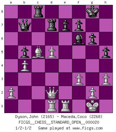 Last move : 1/2-1/2 2025 April 13 23:0:3 [Event "FICGS__CHESS__STANDARD_OPEN__000020"] [Site "FICGS"] [Date "2024.10.17"] [Round "1"] [White "Dyson,John"] [Black "Maceda,Coco"] [Result "1/2-1/2"] [WhiteElo "2165"] [BlackElo "2268"] 1.e4 c5 2.Nf3 d6 3.Bb5+ Bd7 4.Bxd7+ Qxd7 5.c4 Nc6 6.Nc3 Nf6 7.d4 cxd4 8.Nxd4 g6 9.f3 Bg7 10.Be3 O-O 11.O-O a6 12.Qd3 Rfc8 13.b3 b5 14.cxb5 Ne5 15.Qd2 d5 16.Nxd5 Nxd5 17.exd5 axb5 18.Ne2 Rd8 19.Rad1 Qb7 20.Nc3 Nd7 21.Ne4 Nf6 22.Nxf6+ Bxf6 23.Bc5 Rd7 24.Rfe1 Rc8 25.b4 h5 26.h3 1/2-1/2 Follow this game move after move (download)No Chess Grandmaster is normal; they only differ in the extent of their madness. (Viktor Korchnoi) Ein Gewinn durch eine ungenaue Kombination, sei sie auch noch so vorzeigbar, erfüllt mich mit Schaudern. (Wilhelm Steinitz) Evita las multitudes. Haz independientemente tu propio razonamiento. Trata de ser el jugador de Ajedrez, no la pieza de Ajedrez. (Ralph Charell) On croit qu'il y a plus de mauvais joueurs que de bons joueurs, c'est faux : Il y a autant de joueurs qui gagnent que de joueurs qui perdent. (Philippe Geluck) If everyone is thinking alike, then somebody isn't thinking. (US General George S. Patton)