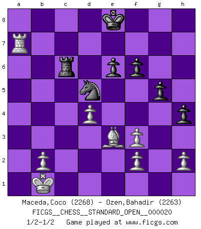 Last move : 1/2-1/2 2025 February 27 7:6:46 [Event "FICGS__CHESS__STANDARD_OPEN__000020"] [Site "FICGS"] [Date "2024.10.17"] [Round "1"] [White "Maceda,Coco"] [Black "Ozen,Bahadir"] [Result "1/2-1/2"] [WhiteElo "2268"] [BlackElo "2263"] 1.d4 d5 2.Nf3 Nf6 3.c4 dxc4 4.e3 e6 5.Bxc4 c5 6.O-O a6 7.Bb3 b5 8.a4 Bb7 9.axb5 axb5 10.Rxa8 Bxa8 11.dxc5 Nbd7 12.c6 Bxc6 13.Nd4 Qb6 14.Nxc6 Qxc6 15.Qf3 Qxf3 16.gxf3 Be7 17.Na3 O-O 18.Nxb5 Rb8 19.Nd4 Bc5 20.Ba2 Bxd4 21.exd4 Rb4 22.Rd1 Nb6 23.Kf1 Nfd5 24.Rd3 Kf8 25.Ke1 g6 26.Bb3 Ke8 27.Kd1 Rb5 28.Ba2 Rb4 29.Kc2 Ra4 30.Bxd5 Nxd5 31.Kb1 Rc4 32.Be3 f6 33.Ra3 g5 34.Ra7 h5 35.Rh7 h4 36.Ra7 Rc6 37.Bd2 Rc4 38.Be3 Rc6 39.Rb7 Kf8 40.Ra7 Ke8 1/2-1/2 Follow this game move after move (download)What would Chess be without silly mistakes ? (Kurt Richter) Alle offensichtlichen Züge sehen nach dem Spiel in der Analyse verdächtig aus. (Viktor Kortschnoi) Combinaciones deslumbrantes son para la mayoría, mover madera es para los pocos. (Georg Kieninger) Le joueur d'Echecs qui veut atteindre le top est obligé de développer son propre credo créatif. Alexeï Stepanovicth Souétine. Il est facile d'écrire des livres ! Ce qui est difficile, c'est de jouer ! (Alexeï Stepanovicth Souétine) It's not the size of the dog in the fight, it's the size of the fight in the dog. (Mark Twain)