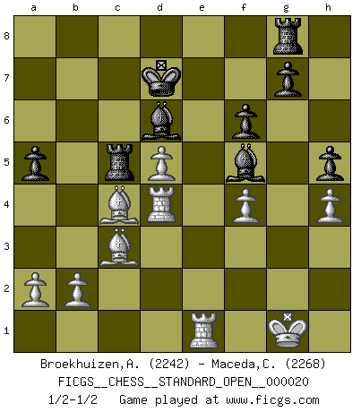 Last move : 1/2-1/2 2025 May 30 16:8:25 [Event "FICGS__CHESS__STANDARD_OPEN__000020"] [Site "FICGS"] [Date "2024.10.17"] [Round "1"] [White "Broekhuizen,A. T. S."] [Black "Maceda,Coco"] [Result "1/2-1/2"] [WhiteElo "2242"] [BlackElo "2268"] 1.d4 d5 2.c4 e6 3.g3 dxc4 4.Bg2 c5 5.Nf3 Nc6 6.e3 cxd4 7.Nxd4 Nxd4 8.Qxd4 Qxd4 9.exd4 Bd7 10.O-O Ne7 11.Bxb7 Rb8 12.Bg2 Nf5 13.d5 e5 14.Nd2 Rc8 15.Rd1 Nd4 16.Nf3 Nxf3+ 17.Bxf3 Bd6 18.Bd2 Bf5 19.Bc3 Kd7 20.Be2 Rc5 21.h4 a5 22.Rd2 h5 23.Re1 Kc8 24.Bf1 f6 25.f4 exf4 26.gxf4 Kd7 27.Rd4 Rg8 28.Bxc4 1/2-1/2 Follow this game move after move (download)There must have been a time when men were demigods, or they could not have invented Chess. (Gustav Schenk) Der beste Spieler in einem Turnier gewinnt es nie. Er landet auf Platz zwei oder drei. (Siegbert Tarrasch) El Ajedrez tiene tanto misterio como las mujeres. (Purdy) Aux échecs, l'amour-propre est satisfait quand on remporte la victoire, mais il n'y a pas de honte à être battu. (Benjamin Franklin) If things go wrong, don't go with them. (Roger Babson)