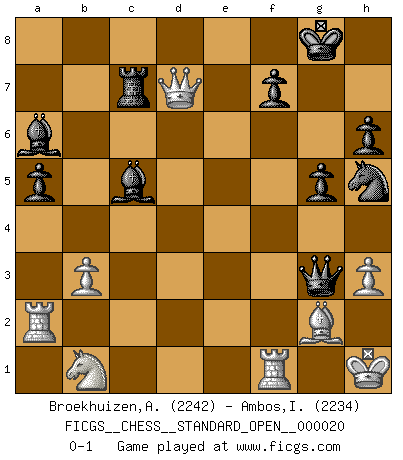 Last move : 0-1 2025 June 8 12:24:4 [Event "FICGS__CHESS__STANDARD_OPEN__000020"] [Site "FICGS"] [Date "2024.10.17"] [Round "2"] [White "Broekhuizen,A. T. S."] [Black "Ambos,Ilmar"] [Result "0-1"] [WhiteElo "2242"] [BlackElo "2234"] 1.d4 Nf6 2.c4 e6 3.g3 d5 4.Bg2 Bb4+ 5.Bd2 Be7 6.Nf3 O-O 7.O-O c6 8.b3 b6 9.Qc2 Nbd7 10.Rd1 Ba6 11.a4 Re8 12.a5 Qc8 13.Qa2 h6 14.Rc1 c5 15.Ne5 Qc7 16.dxc5 Nxe5 17.cxb6 axb6 18.cxd5 Qd6 19.dxe6 Qxe6 20.Bf4 Bb4 21.Qb2 Neg4 22.e3 bxa5 23.h3 Rad8 24.Ra2 g5 25.Bc7 Nxe3 26.fxe3 Qxe3+ 27.Kh2 Nh5 28.Rg1 Rc8 29.Qc1 Rxc7 30.Qxc7 Rc8 31.Qd7 Bc5 32.Rf1 Qxg3+ 33.Kh1 Rc7 0-1 Follow this game move after move (download)Chess is the gymnasium of the mind. (Blaise Pascal) Obwohl ich vom Stil her kaum zu den Priestern der Schachkunst gezählt werde, halte ich Schach doch für eine Kunst. (Tigran Petrosjan) El poder defensivo de una pieza clavada, solamente es imaginario. (Aaron Nimzovich) Des idées, des idées, j'en ai cent, j'en ai mille. Des bonnes, des mauvaises, applicables, irréalisables... Il suffit de faire le tri ! (Roos) Creativity is allowing yourself to make mistakes. Art is knowing which ones to keep. (Scott Adams)