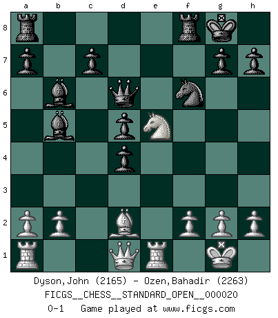 Last move : 0-1 2024 December 9 19:50:10 [Event "FICGS__CHESS__STANDARD_OPEN__000020"] [Site "FICGS"] [Date "2024.10.17"] [Round "1"] [White "Dyson,John"] [Black "Ozen,Bahadir"] [Result "0-1"] [WhiteElo "2165"] [BlackElo "2263"] 1.e4 e5 2.Nf3 Nc6 3.Bc4 Bc5 4.c3 Nf6 5.d4 exd4 6.e5 d5 7.Bb5 Ne4 8.cxd4 Bb6 9.Nc3 O-O 10.Be3 f5 11.exf6 Nxf6 12.Bxc6 bxc6 13.Ne5 Qd6 14.O-O Ba6 15.Re1 c5 16.Bd2 cxd4 17.Nb5 Bxb5 0-1 Follow this game move after move (download)In Fischer's hands, a slight theoretical advantage is as good a being a Queen ahead. (Isaac Kashdan) Modernes Schach sorgt sich zuviel um Dinge wie Bauernstruktur usw. Vergessen Sie das, Schachmatt beendet das Spiel! (Nigel Short) Tu eres para mi la Reina en d8 y yo soy el Peón en d7!!. (GM Eduard Gufeld) Ce qui est bien, c'est d'avoir tout un tas de pièces en prise : l'adversaire ne peut en prendre qu'une à la fois. Cité par Thierry Audin. Computers make it easier to do a lot of things, but most of the things they make it easier to do don't need to be done. (Andy Rooney)