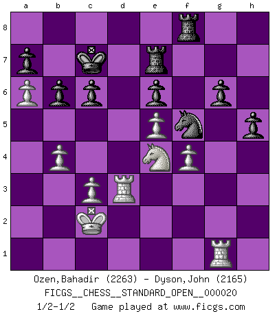 Last move : 1/2-1/2 2025 April 1 8:49:47 [Event "FICGS__CHESS__STANDARD_OPEN__000020"] [Site "FICGS"] [Date "2024.10.17"] [Round "2"] [White "Ozen,Bahadir"] [Black "Dyson,John"] [Result "1/2-1/2"] [WhiteElo "2263"] [BlackElo "2165"] 1.e4 c6 2.Nf3 d5 3.d3 dxe4 4.dxe4 Qxd1+ 5.Kxd1 Nf6 6.Nfd2 g6 7.f3 Bh6 8.a4 Be6 9.Bc4 Bxc4 10.Nxc4 Bxc1 11.Kxc1 Nbd7 12.Nbd2 O-O-O 13.c3 h5 14.h4 Rhg8 15.g3 Ne8 16.Kc2 Nb6 17.Ne5 Nd6 18.a5 Nd7 19.Nd3 f6 20.b4 Ne5 21.Nxe5 fxe5 22.f4 exf4 23.gxf4 Rdf8 24.Raf1 Rg7 25.Rh3 Rgf7 26.Rhf3 b6 27.a6 Kc7 28.e5 Nf5 29.Ne4 Nxh4 30.Rd3 e6 31.Ng5 Re7 32.Rg1 Nf5 33.Ne4 Rg7 34.Rgd1 Re7 35.Rg1 Rg7 36.Rgd1 Re7 37.Rg1 1/2-1/2 Follow this game move after move (download)Methodical thinking is of more use in Chess than inspiration. (C. J. S. Purdy) Schon mancher Spieler hat aufgegeben, um zu vermeiden, daß er eine Figur verliert. (Savielly Grigorievitsch Tartakower) Yo jugué Ajedrez con el y a veces le pude haber ganado solo que siempre devuelve su última jugada y juega la partida de manera diferente. (Mark Twain) C'est la seule position que je connaisse où les deux camps sont mals. Propos prêtés à V. Anand. Children in the dark cause accidents, accidents in the dark cause children. (Unknown)