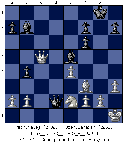 Last move : 1/2-1/2 2025 March 21 12:59:31 [Event "FICGS__CHESS__CLASS_A__000283"] [Site "FICGS"] [Date "2024.10.20"] [Round "1"] [White "Pech,Matej"] [Black "Ozen,Bahadir"] [Result "1/2-1/2"] [WhiteElo "2092"] [BlackElo "2263"] 1.c4 c6 2.d4 d5 3.Nf3 Nf6 4.Nc3 e6 5.e3 Nbd7 6.Qc2 Bd6 7.Bd3 O-O 8.O-O dxc4 9.Bxc4 b5 10.Be2 Bb7 11.Rd1 Qc7 12.e4 e5 13.Bg5 exd4 14.Rxd4 Ne5 15.h3 Nxf3+ 16.Bxf3 Bh2+ 17.Kh1 Be5 18.Bxf6 gxf6 19.Rd2 Rad8 20.Rad1 b4 21.Ne2 c5 22.Rxd8 Rxd8 23.Rxd8+ Qxd8 24.Qxc5 Qd2 1/2-1/2 Follow this game move after move (download)Chess is life. (Bobby Fischer) Glücklicherweise sind Großmeister Ruben Fines reine Schachbücher weniger phallozentrisch [als seine Schachpsychologie] und deswegen auch weniger lächerlich. (Nigel Short) El Ajedrez tiene tanto misterio como las mujeres. (Purdy) Un millionnaire : 'Monsieur Steinitz ! Vous ne participez aux tournois que pour l'argent, alors que moi je n'y viens que pour l'honneur.' Steinitz : 'Chacun joue pour ce qu'il n'a pas'... Convictions are more dangerous enemies of truth than lies. (Friedrich Nietzsche)