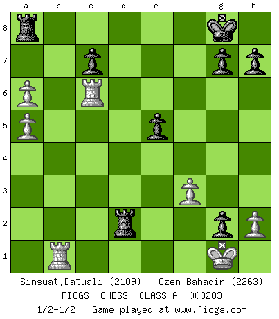 Last move : 1/2-1/2 2024 December 11 7:47:46 [Event "FICGS__CHESS__CLASS_A__000283"] [Site "FICGS"] [Date "2024.10.20"] [Round "1"] [White "Sinsuat,Datuali"] [Black "Ozen,Bahadir"] [Result "1/2-1/2"] [WhiteElo "2109"] [BlackElo "2263"] 1.e4 e5 2.Nf3 Nc6 3.Bb5 a6 4.Ba4 Nf6 5.O-O Nxe4 6.d4 b5 7.Bb3 d5 8.dxe5 Be6 9.Be3 Be7 10.c3 O-O 11.Nbd2 Bg4 12.Nxe4 dxe4 13.Qd5 Qxd5 14.Bxd5 exf3 15.Bxc6 fxg2 16.Rfe1 Rad8 17.a4 b4 18.cxb4 Bxb4 19.Rec1 Bd2 20.Bxd2 Rxd2 21.b4 f6 22.f3 Bc8 23.a5 fxe5 24.b5 Bd7 25.bxa6 Bxc6 26.Rxc6 Ra8 27.Rb1 1/2-1/2 Follow this game move after move (download)If your opponent offers you a draw, try to work out why he thinks he's worse off. (Nigel Short) Ein typischer, sehr verbreiteter Gedankenschädling ist der, daß der betreffende Amateur von der Annanhme ausgeht, daß jeder einzelne Zug etwas zu leisten habe. (Aaron Nimzowitsch) Cuando me preguntan: -¿Cual es el secreto que te hace hacer mejores movidas que tus oponentes?, Yo respondo: Me da gusto que me pregunten eso, porque, como veran, hay una simple razón. Yo pienso mis propias movidas y dejo a mi oponente que el piense las suyas. (Alexander Alekhine) L'action d'une oeuvre littéraire se déroule sur un champ de bataille. Les masques et les types du drame moderne correspondent aux pièces du jeu d'échecs. L'intrigue correspond aux coups et aux gambits, c'est à dire aux techniques du jeu telles qu'utilisées et interprétées par les joueurs. Les tactiques et les péripéties [mouvements] correspondent aux coups exécutés par l'adversaire. (Viktor Shklovsky) Macintosh - we might not get everything right, but at least we knew the century was going to end. (Douglas Adams)