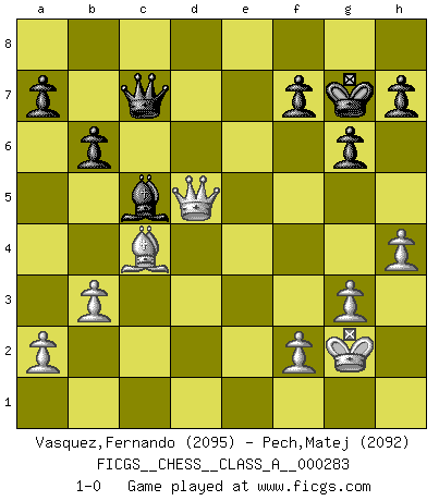 Last move : 1-0 2025 June 19 14:14:53 [Event "FICGS__CHESS__CLASS_A__000283"] [Site "FICGS"] [Date "2024.10.20"] [Round "1"] [White "Vasquez,Fernando"] [Black "Pech,Matej"] [Result "1-0"] [WhiteElo "2095"] [BlackElo "2092"] 1.e4 c5 2.c3 Nf6 3.e5 Nd5 4.d4 cxd4 5.cxd4 d6 6.Nf3 Nc6 7.Bc4 Nb6 8.Bb5 dxe5 9.Nxe5 Bd7 10.Nxd7 Qxd7 11.Nc3 e6 12.O-O Rd8 13.Qb3 Be7 14.Be3 O-O 15.Rfd1 Qc8 16.Rac1 Na5 17.Qc2 Nac4 18.Qe2 Nxe3 19.Qxe3 Qb8 20.d5 Nxd5 21.Rxd5 Rxd5 22.Nxd5 Bd6 23.g3 exd5 24.Rd1 Rd8 25.Rxd5 b6 26.b3 Bc5 27.Qf3 Rxd5 28.Qxd5 g6 29.Bc4 Qc7 30.Kg2 Kg7 31.h4 1-0 This chess game has been lost on time (started : 2024.10.20 19:52:31) Follow this game move after move (download)A man that will take back a move at Chess will pick a pocket. (Richard Fenton) Computer sind die einzigen Gegner, die nicht immer eine Ausrede auf Lager haben, wenn sie gegen mich verlieren. (Robert James Fischer) El Ajedrez es imaginación. (David Bronstein) Echiquier : carré parfait, comme la Jérusalem nouvelle décrite par l'auteur de l'Apocalypse, huit cases sur huit, exaltation du chiffre 4, symbole du cosmos aux quatre horizons... où le noir et le blanc, l'ombre et la lumière, le mal et le bien s'entremêlent et se conjuguent. (Robert Couffignal, Le Gambit du poète) All the biggest technological inventions created by man - the airplane, the automobile, the computer - says little about his intelligence, but speaks volumes about his laziness. (Mark Kennedy)