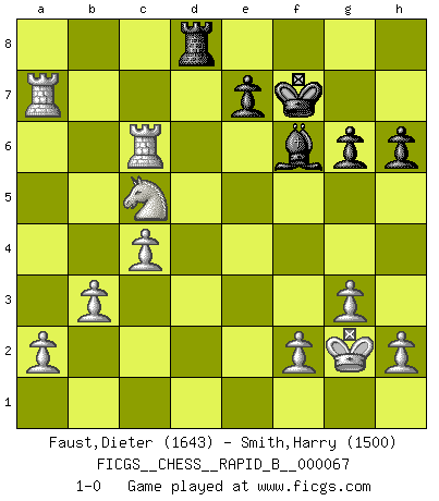 Last move : 1-0 2007 December 22 17:56:8 [Event "FICGS__CHESS__RAPID_B__000067"] [Site "FICGS"] [Date "2007.09.21"] [Round "1"] [White "Faust,Dieter"] [Black "Smith,Harry"] [Result "1-0"] [WhiteElo "1643"] [BlackElo "1500"] 1.Nf3 Nf6 2.c4 g6 3.Nc3 Bg7 4.d4 O-O 5.e4 d6 6.Be2 Nbd7 7.O-O c6 8.e5 dxe5 9.dxe5 Ng4 10.e6 fxe6 11.Ng5 Qc7 12.Bxg4 Nc5 13.Be3 b6 14.Bxc5 bxc5 15.Bxe6+ Bxe6 16.Nxe6 Qc8 17.Nxf8 Bxf8 18.Re1 Rb8 19.Qe2 Qf5 20.Rad1 Re8 21.Qe6+ Qxe6 22.Rxe6 Rc8 23.Ne4 Kf7 24.Nxc5 Bg7 25.Rd7 Bf6 26.Rxa7 Rd8 27.g3 Rd1+ 28.Kg2 Rd8 29.b3 h6 30.Rxc6 1-0 Reti Opening Kingside Castling by player Black (move 4) Kingside Castling by player White (move 7) Player White won this chess game. Follow this game move after move (download)The enormous mental resilience, without which no Chess player can exist, was so much taken up by Chess that he could never free his mind of this game. (Albert Einstein) Ich verlor meine Bürgerrechte, mein Gehalt wurde mir nicht mehr bezahlt und ich wurde zensiert und durfte nicht mehr ins Ausland reisen. [nach dem Match Fischer-Taimanov 6:0] (Mark Taimanov) El jugador blanco perdió porque fallo en recordar la coreccta continuación y tuvo que pensar por sí mismo las movidas. (Siegbert Tarrasch) Celui qui prend des risques peut perdre, celui qui n'en prend pas perd toujours. (Xavier Tartacover) Programmer - an organism that turns coffee into software. (Anonymous)