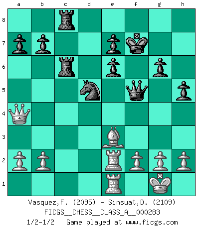 Last move : 1/2-1/2 2025 May 27 5:13:13 [Event "FICGS__CHESS__CLASS_A__000283"] [Site "FICGS"] [Date "2024.10.20"] [Round "1"] [White "Vasquez,Fernando"] [Black "Sinsuat,Datuali"] [Result "1/2-1/2"] [WhiteElo "2095"] [BlackElo "2109"] 1.e4 c5 2.c3 Nf6 3.e5 Nd5 4.d4 cxd4 5.cxd4 d6 6.Nf3 Nc6 7.Bc4 dxe5 8.dxe5 Be6 9.O-O g6 10.Ng5 Bg7 11.Nxe6 fxe6 12.Nd2 Nxe5 13.Bb5+ Kf7 14.Re1 Qb6 15.Nc4 Qxb5 16.Nxe5+ Bxe5 17.Rxe5 Qc6 18.Bg5 Rac8 19.Qb3 Rhd8 20.Qh3 h5 21.Rae1 Rd6 22.Bd2 Qc2 23.Qf3+ Ke8 24.R5e2 Qf5 25.Qb3 Rb6 26.Qa4+ Kf7 27.Be3 Rbc6 1/2-1/2 Follow this game move after move (download)Best by test: 1. e4 (Bobby Fischer) Im Hotelzimmer gab es nur zwei Schaben. (Über die Turnierbedingungen) (Peter Swidler) Un buen jugador siempre tiene buena suerte. (José Raúl Capablanca) Nous vivons dans un monde échiquéen : chaque jour qui passe est un défi à relever. (Philosophe Sasha) The difference between perseverance and obstinacy is that one comes from a strong will, and the other from a strong won't. (Henry Ward Beecher)