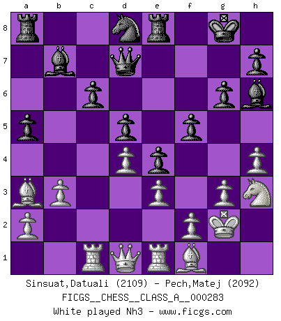 Last move : 1-0 2025 June 18 4:50:43 [Event "FICGS__CHESS__CLASS_A__000283"] [Site "FICGS"] [Date "2024.10.20"] [Round "1"] [White "Sinsuat,Datuali"] [Black "Pech,Matej"] [Result "1-0"] [WhiteElo "2109"] [BlackElo "2092"] 1.c4 e5 2.Nc3 Nc6 3.g3 f5 4.Bg2 Nf6 5.b3 g6 6.d3 d6 7.e3 Qe7 8.Nd5 Nxd5 9.cxd5 Nd8 10.Ne2 Bg7 11.O-O O-O 12.Ba3 c5 13.dxc6 bxc6 14.Rc1 Qd7 15.Re1 Bb7 16.d4 e4 17.Nf4 a5 18.h4 Re8 19.Bf1 d5 20.Kg2 Bh6 21.Nh3 Ne6 22.Qd2 Ba6 23.Bxa6 Rxa6 24.Rc3 1-0 This chess game has been lost on time (started : 2024.10.20 19:52:31) Follow this game move after move (download)Nowadays, when you're not a grandmaster at 14, you can forget about it. (Anand Viswanathan) Dieses schreckliche Gefühl, dass ich gegen eine Maschine spielte, die niemals Fehler macht, zerschmetterte meinen Widerstand. (Mark Taimanov) Observen a Garry Kasparov. Después de una derrota, invariablemente el gana la próxima partida. Prácticamente hace pedazos a su siguiente oponente. Eso es algo que tenemos que aprender a lograr. (Maurice Ashley) Ne tendez aucun piège pour le plaisir ! Ne jouez rien dans l'espoir que l'adversaire réagisse de façon stupide ! Prenez toujours pour acquis que l'adversaire va trouver le meilleur coup ! Ne jouez jamais de coup dans l'espoir que l'adversaire ne voie pas la menace ! Chacun de vos coups doit améliorer la position d'une façon ou d'une autre. Beta. Software undergoes beta testing shortly before it's released. Beta is latin for still doesn't work. (Anonymous)