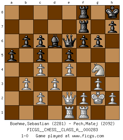Last move : 1-0 2025 June 11 23:10:5 [Event "FICGS__CHESS__CLASS_A__000283"] [Site "FICGS"] [Date "2024.10.20"] [Round "1"] [White "Boehme,Sebastian"] [Black "Pech,Matej"] [Result "1-0"] [WhiteElo "2281"] [BlackElo "2092"] 1.e4 e5 2.Nf3 Nc6 3.Bb5 Nf6 4.d3 Bc5 5.Bxc6 dxc6 6.Nbd2 Be6 7.O-O Nd7 8.Nb3 Bb6 9.Ng5 Bxb3 10.axb3 f6 11.Nf3 Nc5 12.Nd2 O-O 13.Nf3 Ne6 14.Kh1 Qd7 15.Nh4 Nd4 16.Be3 a5 17.Bd2 Rfe8 18.g3 Qh3 19.Bc3 Nb5 20.Nf3 Nxc3 21.bxc3 Bc5 22.Ra2 b6 23.Qe2 Bd6 24.Rfa1 Rad8 25.Ra4 Qe6 26.Kg2 c5 27.Rf1 Re7 28.R4a1 g6 29.Rae1 Kh8 30.Nd2 Rf7 31.Nc4 Ra8 32.Ne3 Raf8 33.c4 c6 34.Ng4 1-0 This chess game has been lost on time (started : 2024.10.20 19:52:31) Follow this game move after move (download)Any material change in a position must come about by mate, a capture, or a Pawn promotion. (Purdy) Es hat in meinem Leben Zeiten gegeben, da ich sehr nahe daran war zu glauben, daß ich auch nicht eine einzige Schachpartie verlieren könnte. (José Raúl Capablanca) Los libros de Ajedrez deben de usarse igual como usamos los anteojos: para mejorar la vista, aunque algunos jugadores los quieren usar como si ellos les otorgaran la vision. (José Raúl Capablanca) Il vaut toujours mieux jouer un plan faux de façon logique que de n'avoir pas de plan du tout. (Victor Kortchnoï) Man is still the most extraordinary computer of all. (John F. Kennedy)