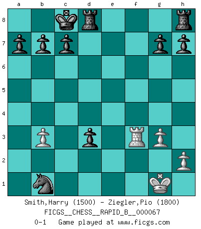 Last move : 0-1 2007 November 19 1:39:49 [Event "FICGS__CHESS__RAPID_B__000067"] [Site "FICGS"] [Date "2007.09.21"] [Round "1"] [White "Smith,Harry"] [Black "Ziegler,Pio"] [Result "0-1"] [WhiteElo "1500"] [BlackElo "1800"] 1.e4 e5 2.d3 Nf6 3.Nf3 Nc6 4.g3 d5 5.Bg2 dxe4 6.Nfd2 Bg4 7.f3 exf3 8.Bxf3 Bxf3 9.Nxf3 Bb4+ 10.Bd2 Qe7 11.Bxb4 Qxb4+ 12.Nbd2 O-O-O 13.O-O e4 14.c3 Qb6+ 15.Nd4 Nxd4 16.cxd4 Qxd4+ 17.Kg2 exd3 18.Nf3 Qxb2+ 19.Rf2 Qb6 20.Ne5 Qb5 21.Rb1 Qxe5 22.Qb3 Qd5+ 23.Kg1 Qxb3 24.axb3 Ne4 25.Rxf7 Nc3 26.Rf3 Nxb1 0-1 Variation Indian Opening : Indian Opening Queenside Castling by player Black (move 12) Kingside Castling by player White (move 13) Player Black won this chess game. Follow this game move after move (download)It is the aim of the modern school, not to treat every position according to one general law, but according to the principle inherent in the position. (Richard Reti) Im Leben werden Partien nie so unstrittig gewonnen wie im Spiel (Emanuel Lasker) Por esta medida (el intervalo entre Fischer y sus contemporaneos), yo le considero el mas grande campeón mundial. (Garry Kasparov) Des idées, des idées, j'en ai cent, j'en ai mille. Des bonnes, des mauvaises, applicables, irréalisables... Il suffit de faire le tri ! (Roos) If you know the enemy and know yourself you need not fear the results of a hundred battles. (Sun Tzu)