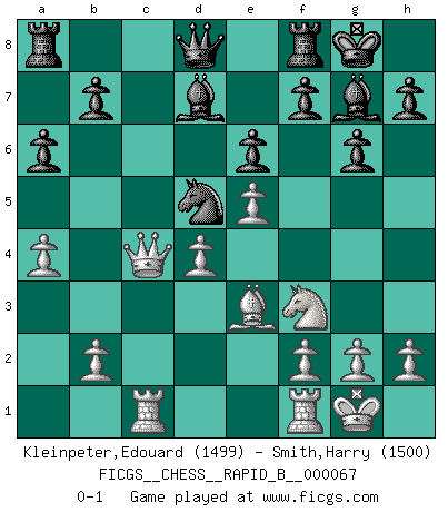 Last move : 0-1 2007 November 28 7:53:35 [Event "FICGS__CHESS__RAPID_B__000067"] [Site "FICGS"] [Date "2007.09.21"] [Round "1"] [White "Kleinpeter,Edouard"] [Black "Smith,Harry"] [Result "0-1"] [WhiteElo "1499"] [BlackElo "1500"] 1.e4 c5 2.Nf3 e6 3.c3 g6 4.d4 Bg7 5.Bd3 Ne7 6.O-O cxd4 7.cxd4 Nbc6 8.Be3 O-O 9.Nbd2 Nb4 10.Nc4 Nxd3 11.Qxd3 d5 12.e5 dxc4 13.Qxc4 Nd5 14.Rac1 a6 15.a4 Bd7 0-1 This chess game has been lost on time (started : 2007.09.21 10:9:13) Sicilian defense Kingside Castling by player White (move 6) Kingside Castling by player Black (move 8) Player Black won this chess game. Follow this game move after move (download)I play correspondence chess because it is both art and science while chess is art only. (A player at FICGS) Die jungen Leute sollen verstehen, dass sie noch etwas von mir lernen können und müssen. (Viktor Kortschnoi) Combinaciones deslumbrantes son para la mayoría, mover madera es para los pocos. (Georg Kieninger) Ce qui est bien, c'est d'avoir tout un tas de pièces en prise : l'adversaire ne peut en prendre qu'une à la fois. Cité par Thierry Audin. They misunderestimated me. (George W. Bush, Bentonville nov. 6, 2000)