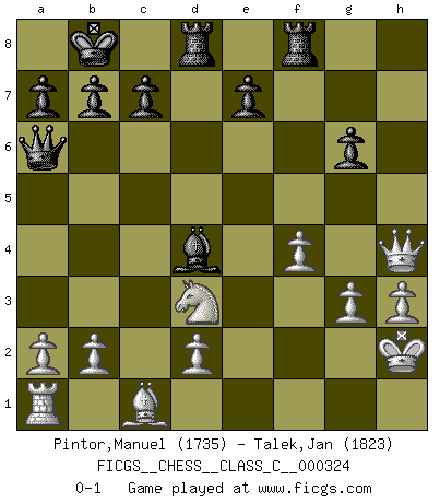 Last move : 0-1 2024 November 25 17:40:2 [Event "FICGS__CHESS__CLASS_C__000324"] [Site "FICGS"] [Date "2024.10.26"] [Round "1"] [White "Pintor,Manuel"] [Black "Talek,Jan"] [Result "0-1"] [WhiteElo "1735"] [BlackElo "1823"] 1.e4 g6 2.f4 d5 3.exd5 Qxd5 4.Nc3 Qa5 5.Nf3 Bg7 6.Bc4 Nc6 7.Bb3 Bg4 8.O-O O-O-O 9.Bxf7 Nh6 10.Bb3 Nd4 11.Ne4 Nxb3 12.cxb3 Nf5 13.Nf2 h5 14.h3 Ne3 15.b4 Qb6 16.Qe2 Nxf1 17.Kxf1 Bxf3 18.Qxf3 Qxb4 19.Kg1 Rhf8 20.g3 Bd4 21.Kh2 h4 22.Nd3 Qd6 23.Qg4+ Kb8 24.Qxh4 Qa6 0-1 Follow this game move after move (download)Chess demands total concentration. (Bobby Fischer) Ich kenne Menschen, die allen Willen der Welt besitzen und doch nicht Schach spielen können. (Robert James Fischer) Morphy probablemente fue el genio más grande de todos. (Bobby Fischer) La guerre est enfant de la passion, la passion est enfant du narcissisme et le narcissisme est l'enfant. (...) Une autre partie ? (Thibault de Vassal) The next best thing to gambling and winning is gambling and loosing. (Nick Dandalos)