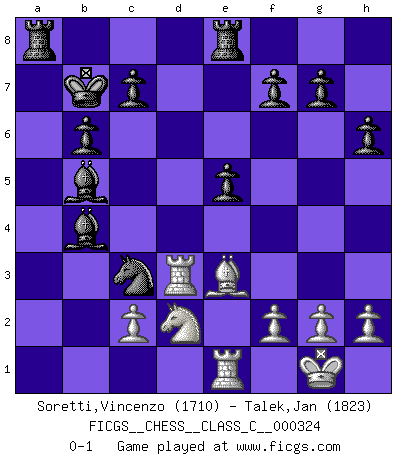 Last move : 0-1 2024 November 25 8:25:18 [Event "FICGS__CHESS__CLASS_C__000324"] [Site "FICGS"] [Date "2024.10.26"] [Round "1"] [White "Soretti,Vincenzo"] [Black "Talek,Jan"] [Result "0-1"] [WhiteElo "1710"] [BlackElo "1823"] 1.d4 d6 2.e4 Nf6 3.Nc3 e5 4.dxe5 dxe5 5.Qxd8+ Kxd8 6.Nf3 Bd6 7.Bg5 Be6 8.Rd1 Nbd7 9.Bb5 Kc8 10.O-O h6 11.Bxd7+ Nxd7 12.Be3 b6 13.a3 Re8 14.Nb5 Bf8 15.Rd2 Bc4 16.Rfd1 Bxb5 17.Rd5 Bc6 18.R5d2 a5 19.Rd3 Nc5 20.Rc3 Kb7 21.b4 Nxe4 22.Rcd3 axb4 23.axb4 Bxb4 24.Nd2 Nc3 25.Re1 Bb5 0-1 Follow this game move after move (download)Help your pieces so they can help you. (Paul Morphy) Wer wird heute Abend ihr Gegner sein? -- Heute Abend spiele ich gegen die schwarzen Steine. (Akiba Rubinstein) El Ajedrez es como la guerra en un tablero. (Bobby Fischer) Si le désir cupide (et stupide) de gagner est une inépuisable source de souffrance, une combinaison brillante sur l'échiquier est une découverte : le coquelicot qui s'épanouit lorsque apparaît la Voie Lactée. (Arrabal) There is a very easy way to return from a casino with a small fortune : go there with a large one. (Jack Yelton)