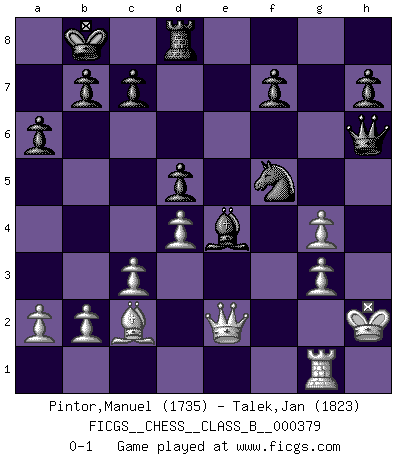 Last move : 0-1 2024 November 30 2:27:10 [Event "FICGS__CHESS__CLASS_B__000379"] [Site "FICGS"] [Date "2024.10.26"] [Round "1"] [White "Pintor,Manuel"] [Black "Talek,Jan"] [Result "0-1"] [WhiteElo "1735"] [BlackElo "1823"] 1.e4 e5 2.f4 exf4 3.Nf3 g5 4.Bc4 g4 5.O-O gxf3 6.Qxf3 Qf6 7.c3 d6 8.d4 Bh6 9.Nd2 Nc6 10.Qh5 Qg6 11.Qh4 Nf6 12.Nf3 Rg8 13.Ne1 Bg5 14.Qf2 Nxe4 15.Qe2 Bf5 16.Nf3 O-O-O 17.Nxg5 Nxg5 18.Bxf4 Nh3+ 19.Kh1 d5 20.Bb5 Nxf4 21.Rxf4 Be4 22.Rg1 Kb8 23.h3 Ne7 24.Rg4 Qe6 25.Kh2 a6 26.Ba4 Qd6+ 27.g3 Nf5 28.Bc2 Rxg4 29.hxg4 Qh6+ 0-1 Follow this game move after move (download)The older I grow, the more I value Pawns. (Keres) Es hat in meinem Leben Zeiten gegeben, da ich sehr nahe daran war zu glauben, daß ich auch nicht eine einzige Schachpartie verlieren könnte. (José Raúl Capablanca) Yo adoro todas la posiciones. Denme una partida posicional difícil, y la jugaré. Pero posiciones totalmente ganadas, no las tolero. (Hein Donner) Le jeu d'échecs est comme rejeté hors du temps. (Antoine de Saint-Exupéry) All war is based on deception. (Sun Tzu)
