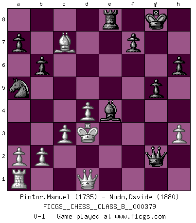 Last move : 0-1 2024 December 4 1:51:44 [Event "FICGS__CHESS__CLASS_B__000379"] [Site "FICGS"] [Date "2024.10.26"] [Round "1"] [White "Pintor,Manuel"] [Black "Nudo,Davide"] [Result "0-1"] [WhiteElo "1735"] [BlackElo "1880"] 1.e4 e5 2.f4 exf4 3.Nf3 d6 4.Bc4 h6 5.O-O g5 6.d3 Bg7 7.c3 Nc6 8.Nbd2 Nf6 9.d4 O-O 10.h3 d5 11.exd5 Nxd5 12.Ne4 Re8 13.Nc5 b6 14.Nd3 Na5 15.Bxd5 Qxd5 16.Nde5 Bb7 17.Rf2 Bxe5 18.Nxe5 Rxe5 19.Bxf4 Rf5 20.Bxc7 Rxf2 21.Kxf2 Qxg2+ 22.Ke3 Re8+ 23.Kd3 Be4+ 0-1 Follow this game move after move (download)Not only will I predict his triumph over Botvinnik, but I'll go further and say that he'll probably be the greatest Chess player that ever lived. (John Collins) Jeder leidlich begabte Spieler, er braucht keineswegs hervorragend veranlagt zu sein, kann es zum Meister bringen. Aber das ist ja auch gar nicht nötig! Der richtige Standpunkt ist es, zu seinem Vergnügen zu spielen, und man glaube ja nicht, dass der Genuss proportional dem Können sei. (Siegbert Tarrasch) ¿Que sería del Ajedrez sin errores graciosos?. (Kurt Richter) Que feriez-vous si vous étiez en train de jouer aux échecs et que la fin du monde arrive ? Je continuerais à jouer. (Saint Borromée) Do not put your faith in what statistics say until you have carefully considered what they do not say. (William W. Watt)