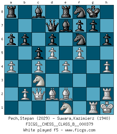 Last move : 0-1 2025 June 19 2:1:52 [Event "FICGS__CHESS__CLASS_B__000379"] [Site "FICGS"] [Date "2024.10.26"] [Round "1"] [White "Pech,Stepan"] [Black "Suwara,Kazimierz"] [Result "0-1"] [WhiteElo "2029"] [BlackElo "1940"] 1.d4 c5 2.d5 e5 3.e4 d6 4.c4 Be7 5.Nf3 Nf6 6.Nc3 Nbd7 7.Be2 O-O 8.O-O Ne8 9.Kh1 b6 10.a4 Nef6 11.g3 a6 12.Rg1 Re8 13.Bd2 Bb7 14.h4 Ng4 15.Rg2 h6 16.Qc2 Nf8 17.Rag1 Qd7 18.Ne1 Bc8 19.f3 Nf6 20.f4 exf4 21.gxf4 Qh3+ 22.Rh2 Qd7 23.f5 Kh8 0-1 This chess game has been lost on time (started : 2024.10.26 12:44:5) Follow this game move after move (download)I'm not afraid of Spassky. The world knows I'm the best. You don't need a match to prove it. (Bobby Fischer) Zeige mir drei Eröffnungsvarianten und ich beweise dir, dass zwei davon inkorrekt sind. (Emanuel Lasker) Debió haber existido una vez en que los hombres eran semidióses, de otra manera no hubiesen podido inventar el Ajedrez. (Gustav Schenk) Assurément je connaissais par expérience le mystérieux attrait de ce jeu royal, le seul entre tous les jeux inventés par les hommes qui échappe souverainement à la tyrannie du hasard, le seul où l'on ne doive sa victoire qu'à son intelligence ou plutôt à une certaine forme d'intelligence. Mais n'est-ce pas déjà le limiter injurieusement que d'appeler les échecs un jeu ? N'est-ce pas une science, un art ou quelque chose qui, comme le cercueil de Mahomet entre ciel et terre, est suspendu entre l'un et l'autre, et qui réunit un nombre incroyable de contraires ? [...] C'est une pensée qui ne mène à rien, une mathématique qui n'établit rien, un art qui ne laisse pas d'uvre, une architecture sans matière; et il l'a prouvé néanmoins qu'il était plus durable, à sa manière, que les livres ou que tout autre monument, ce jeu unique qui appartient à tous les peuples et à tous les temps, et dont personne ne sait quel dieu en fit don à la terre pour tuer l'ennui, pour aiguiser l'esprit et stimuler l'âme. Où commence-t-il, où finit-il ? (Stefan Zweig) Good luck. You're gonna need it. (Han Solo in Star Wars ep.6)