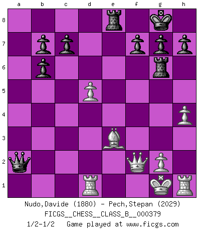 Last move : 1/2-1/2 2025 March 30 1:33:58 [Event "FICGS__CHESS__CLASS_B__000379"] [Site "FICGS"] [Date "2024.10.26"] [Round "1"] [White "Nudo,Davide"] [Black "Pech,Stepan"] [Result "1/2-1/2"] [WhiteElo "1880"] [BlackElo "2029"] 1.e4 e5 2.f4 Bc5 3.Nf3 d6 4.c3 Nf6 5.d4 exd4 6.cxd4 Bb6 7.Nc3 O-O 8.e5 dxe5 9.fxe5 Nc6 10.exf6 Bg4 11.Be2 Re8 12.Kf1 Qxf6 13.Nd5 Qg6 14.Nxb6 Rad8 15.d5 axb6 16.Qd2 Bxf3 17.Bxf3 Ne5 18.Qd1 Nxf3 19.Qxf3 Qc2 20.Be3 Rd6 21.Kg1 Qxb2 22.Rd1 Qxa2 23.h4 Rf6 24.Qg3 Rg6 25.Qf2 1/2-1/2 Follow this game move after move (download)Don't even mention losing to me. I can't stand to think of it. (Bobby Fischer) Offensichtlich kennt Kasparow nichts anderes als Schach, und ich könnte 500 weitere Spieler dieser Sorte benennen. (Judith Polgar) El Ajedrez es de 30 a 40 por ciento psicología. Uno no cuenta con esto cuando se juega contra una computadora. No lo puedo confundir. (Judith Polgar) Le profane ne songe pas à la somme de jouissance dont il se prive, qui méconnaît ce jeu aux ressources aussi variées que passionnantes. (Jean-Marie Jeanton-Lamarche) Before all elsed, be armed. (Niccolo Machiavelli)
