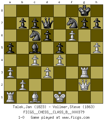 Last move : 1-0 2025 January 4 11:38:32 [Event "FICGS__CHESS__CLASS_B__000379"] [Site "FICGS"] [Date "2024.10.26"] [Round "1"] [White "Talek,Jan"] [Black "Vollmer,Steve"] [Result "1-0"] [WhiteElo "1823"] [BlackElo "1863"] 1.h4 e5 2.c4 Nf6 3.Nc3 Nc6 4.g3 Bc5 5.Bg2 O-O 6.a3 a5 7.e3 d6 8.Nf3 Bf5 9.d3 Qd7 10.Nd5 Ng4 11.Ng5 Rae8 12.f3 Nh6 13.g4 Be6 14.Qc2 f5 15.Nxe6 Rxe6 16.Bh3 fxg4 17.fxg4 Rf3 18.g5 Rxh3 19.Rxh3 Rg6 20.Qg2 Qf5 21.Rg3 Nf7 22.e4 Qd7 23.h5 Re6 24.Nf6+ Rxf6 25.gxf6 1-0 Follow this game move after move (download)Of Chess it has been said that life is not long enough for it, but that is the fault of life, not Chess. (William Ewart Napier) Offener Brief an US-Präsident Bush anlässlich der Verhaftung Bobby Fishers: Verhaften Sie mich. Stecken Sie mich in dieselbe Zelle wie Bobby Fisher und geben Sie uns ein Schachspiel mit. (Boris Vassilievich Spassky) El jugador de combinación piensa hacia adelante; comienza de la posición dada y trabaja las movidas contundentes en su mente. (Emanuel Lasker) Vous savez, camarade Pachman, je n'éprouve pas de plaisir à être ministre, je jouerais plutôt aux échecs comme vous, ou alors ferais une révolution au Venezuela. (Che Guevara à Ludek Pachman, 'Checkmate in Prague', 1975) I take risks, sometimes patients die, but not taking risks causes more patients to die. So I guess my biggest problem is I've been cursed with the ability to do the math. (Gregory House, House M.D.)