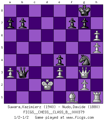 Last move : 1/2-1/2 2025 February 10 22:7:2 [Event "FICGS__CHESS__CLASS_B__000379"] [Site "FICGS"] [Date "2024.10.26"] [Round "1"] [White "Suwara,Kazimierz"] [Black "Nudo,Davide"] [Result "1/2-1/2"] [WhiteElo "1940"] [BlackElo "1880"] 1.d4 Nf6 2.c4 e6 3.Nc3 Bb4 4.Qc2 O-O 5.a3 Bxc3+ 6.Qxc3 d5 7.Bg5 c5 8.dxc5 d4 9.Qf3 Nbd7 10.e3 h6 11.Bxf6 Nxf6 12.O-O-O e5 13.Ne2 Bg4 14.Qg3 d3 15.f3 Rc8 16.Nc3 e4 17.fxg4 Rxc5 18.h4 Rxc4 19.g5 Rxc3+ 20.bxc3 Qc8 21.Kd2 Ng4 22.gxh6 Rd8 23.h5 Qe6 24.c4 Qb6 25.Ke1 d2+ 26.Ke2 Qe6 27.Rxd2 Qxc4+ 28.Kd1 Qb3+ 29.Ke2 Rxd2+ 30.Kxd2 1/2-1/2 Follow this game move after move (download)He who takes the Queen's Knight's Pawn will sleep in the streets. (Anonymous) Im Fernschach kannst du während dem Spiel rauchen. (John Christen Knudsen) Diferente gente reacciona diferentemente en aceptar la derrota. (Bobby Fischer) Si le désir cupide (et stupide) de gagner est une inépuisable source de souffrance, une combinaison brillante sur l'échiquier est une découverte : le coquelicot qui s'épanouit lorsque apparaît la Voie Lactée. (Arrabal) The project of the man are lower than those of the sky. (Chinese proverb)