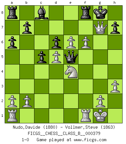 Last move : 1-0 2025 March 30 13:48:40 [Event "FICGS__CHESS__CLASS_B__000379"] [Site "FICGS"] [Date "2024.10.26"] [Round "1"] [White "Nudo,Davide"] [Black "Vollmer,Steve"] [Result "1-0"] [WhiteElo "1880"] [BlackElo "1863"] 1.d4 Nf6 2.c4 e6 3.Nc3 c5 4.d5 exd5 5.cxd5 d6 6.e4 Be7 7.Bd3 Nbd7 8.f4 O-O 9.Nf3 Re8 10.O-O Nf8 11.e5 Ng4 12.h3 Nh6 13.Qc2 f5 14.e6 a6 15.Bxf5 Nxf5 16.Qxf5 Bf6 17.Qg4 Ng6 18.f5 Ne5 19.Nxe5 Bxe5 20.Bg5 Bf6 21.Bxf6 Qxf6 22.Ne4 Qe5 23.f6 Rf8 24.Qxg7+ 1-0 Follow this game move after move (download)Chess is a part of culture and if a culture is declining then Chess too will decline. (Mikhail Botvinnik) Ich würde mich als ganz normalen Jungen bezeichnen [Im Alter von 12]. (Sergej Karjakin) Para mi, el Ajedrez es la vida y cada partida es como una nueva vida. Todo jugador de Ajedrez suele vivir muchas vidas durante su vida. (Eduard Gufeld) La vie est comme un jeu d'échecs : nous esquissons un plan, mais celui-ci est tributaire de ce que daignent faire l'adversaire aux échecs et le destin dans la vie. (Arthur Schopenhauer) Control your own destiny or someone else will. (Jack Welch)