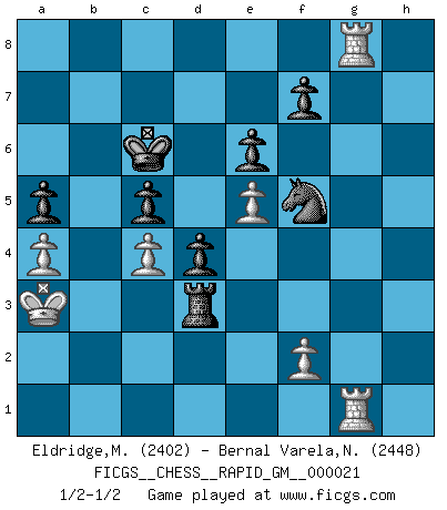 Last move : 1/2-1/2 2025 February 16 19:0:22 [Event "FICGS__CHESS__RAPID_GM__000021"] [Site "FICGS"] [Date "2024.10.26"] [Round "1"] [White "Eldridge,Mark"] [Black "Bernal Varela,Nelson"] [Result "1/2-1/2"] [WhiteElo "2402"] [BlackElo "2448"] 1.d4 e6 2.e4 c5 3.Nf3 cxd4 4.Nxd4 Nc6 5.Nc3 a6 6.Nxc6 bxc6 7.Bd3 d5 8.O-O Nf6 9.Re1 Be7 10.e5 Nd7 11.Qg4 Kf8 12.Bd2 h5 13.Qf3 Kg8 14.Na4 Rb8 15.b3 Qc7 16.Rab1 c5 17.c4 d4 18.Nb2 Bb7 19.Qe2 a5 20.Bc2 Nf8 21.h3 g5 22.Be4 Bxe4 23.Qxe4 Qb7 24.Qxb7 Rxb7 25.Nd3 Ra7 26.Kf1 Kg7 27.Ke2 Ng6 28.Kf3 Nf8 29.Ke2 Ng6 30.Kf3 Nf8 31.a4 Ng6 32.g3 h4 33.Rg1 hxg3 34.Rxg3 Kf8 35.Ke2 Rh5 36.Kd1 Ke8 37.Kc2 Kd7 38.Rbg1 Kc6 39.Rf3 Bd8 40.Rg4 Nh4 41.Rfg3 Nf5 42.Rg1 Rxh3 43.Bxg5 Bxg5 44.Rxg5 Rb7 45.Rg8 Rxb3 46.Kxb3 Rxd3+ 47.Ka2 Rd2+ 48.Kb3 Rd3+ 49.Ka2 Rd2+ 50.Ka3 Rd3+ 51.Kb2 Rd2+ 52.Ka3 Rd3+ 53.Kb2 Rd2+ 54.Ka3 Rd3+ 1/2-1/2 Follow this game move after move (download)You cannot play at Chess if you are kind-hearted. (French Proverb) Ein Springer auf f6 gegen die eigene Rochadestellung ist schlimmer als ein rostiger Nagel im Knie. (Efim Bogoljubov) Creo que una cierta cantidad de temperamento es esperada de los genios del Ajedrez. (Ron Gross) Que feriez-vous si vous étiez en train de jouer aux échecs et que la fin du monde arrive ? Je continuerais à jouer. (Saint Borromée) Follow your passion, and success will follow you. (Arthur Buddhold)