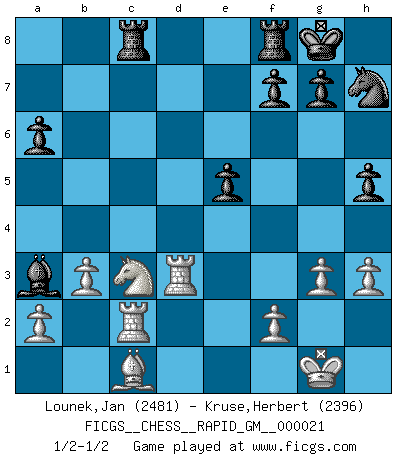 Last move : 1/2-1/2 2024 November 23 5:2:9 [Event "FICGS__CHESS__RAPID_GM__000021"] [Site "FICGS"] [Date "2024.10.26"] [Round "1"] [White "Lounek,Jan"] [Black "Kruse,Herbert"] [Result "1/2-1/2"] [WhiteElo "2481"] [BlackElo "2396"] 1.e4 c5 2.Nf3 d6 3.d4 cxd4 4.Nxd4 Nf6 5.Nc3 a6 6.h3 e5 7.Nde2 h5 8.g3 Be7 9.Bg2 b5 10.Nd5 Nxd5 11.Qxd5 Ra7 12.Be3 Rb7 13.Qd2 Nd7 14.b3 Rb8 15.O-O O-O 16.Nc3 Nf6 17.Rac1 b4 18.Na4 Bb7 19.Qd3 d5 20.exd5 Bxd5 21.Rfd1 Bxg2 22.Kxg2 Qc8 23.c4 bxc3 24.Nxc3 Qb7+ 25.Kg1 Rbc8 26.Bg5 Ba3 27.Rc2 Nh7 28.Be3 Qf3 29.Bc1 Qxd3 30.Rxd3 1/2-1/2 Follow this game move after move (download)Chess is a foolish expedient for making idle people believe they are doing something very clever when they are only wasting their time. (George Bernard Shaw) Schach ist das schnellste Spiel der Welt, weil man in jeder Sekunde Tausende von Gedanken ordnen muß. (Albert Einstein) a manera como él juega al Ajedrez, demuestra la completa naturaleza de un hombre. (Stanley Ellin) La vie et les Echecs sont tous les deux une lutte constante. (Lasker) Men should grow up. - Yeah. And dogs should stop licking themselves. It's not gonna happen. (Gregory House to Dr. Cameron, House M.D.)