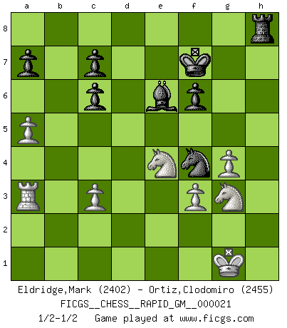 Last move : 1/2-1/2 2024 November 24 16:50:15 [Event "FICGS__CHESS__RAPID_GM__000021"] [Site "FICGS"] [Date "2024.10.26"] [Round "1"] [White "Eldridge,Mark"] [Black "Ortiz,Clodomiro"] [Result "1/2-1/2"] [WhiteElo "2402"] [BlackElo "2455"] 1.e4 e5 2.Nf3 Nc6 3.Bb5 Nf6 4.O-O Nxe4 5.d4 Nd6 6.Bxc6 dxc6 7.dxe5 Nf5 8.Qxd8+ Kxd8 9.Nc3 Bd7 10.h3 b6 11.g4 Ne7 12.Ng5 Ke8 13.Rd1 Nd5 14.Nge4 Nb4 15.Rd2 h5 16.f3 Be7 17.a3 Nd5 18.Ne2 hxg4 19.hxg4 f5 20.exf6 gxf6 21.N2g3 b5 22.a4 b4 23.c3 bxc3 24.bxc3 Be6 25.a5 Rb8 26.Rb2 Rxb2 27.Bxb2 Kf7 28.Ba3 Bxa3 29.Rxa3 Nf4 1/2-1/2 Follow this game move after move (download)There are two types of sacrifices: correct ones and mine. (Mikhail Tal) Im Schach nämlich geht es darum, daß Ich des Gegners klein zu kriegen, sein Ego zu zerbrechen und zu zermahlen, seine Selbstachtung zu zertreten und zu verscharren und seine ganze mißachtenswerte sogenannte Persönlichkeit ein für alle Mal tot zu hacken und zu zerstampfen und dadurch die menschliche Gesellschaft von einer stinkenden Pestbeule zu befreien. Es ist ein königliches Spiel. (Robert James Fischer) Siempre es mucho mejor sacrificar las piezas de tu oponente. (Savielly Tartakover) Je fais ceci parce que dans cinquante coups j'obtiendrai cela; je m'appelle Mikhail Moisevitch Botvinnik. (Botvinnik) In fact if nothing is done against this teddy bear, hereby I announce that I would quit chess, rapid chess, blitz chess, postal chess, email chess, server chess and correspondence chess I will then switch to a table game where teddy bears aren't going to be seen for a while, like Poker, or Roulette, all 18+ games. (Elmer Valderrama)