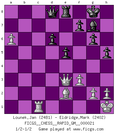 Last move : 1/2-1/2 2024 November 29 22:12:9 [Event "FICGS__CHESS__RAPID_GM__000021"] [Site "FICGS"] [Date "2024.10.26"] [Round "1"] [White "Lounek,Jan"] [Black "Eldridge,Mark"] [Result "1/2-1/2"] [WhiteElo "2481"] [BlackElo "2402"] 1.e4 c5 2.Nf3 d6 3.d4 cxd4 4.Nxd4 Nf6 5.Nc3 a6 6.Be3 e5 7.Nb3 Be6 8.f3 h5 9.Nd5 Bxd5 10.exd5 Nbd7 11.Qd2 g6 12.Be2 Bg7 13.O-O b6 14.Rad1 O-O 15.Kh1 Re8 16.Qe1 Qc7 17.c4 b5 18.Nd2 Rab8 19.Qf2 Nb6 20.cxb5 Nbxd5 21.Ba7 Rb7 22.Rc1 Qd8 23.bxa6 Rxb2 24.Nc4 Rxa2 25.Ra1 Rc2 26.Na3 Rb2 27.Nc4 Rc2 28.Ne3 Nxe3 29.Bxe3 Nd5 30.Rfc1 Rb2 31.Rcb1 Rc2 32.Rc1 Nxe3 33.Qxe3 Rxc1+ 34.Rxc1 1/2-1/2 Follow this game move after move (download)Of all my Russian books, the defense contains and diffuses the greatest 'warmth' which may seem odd seeing how supremely abstract Chess is supposed to be. (Vladimir Nabokov) Schach sollte überall auf der Welt Schulfach werden. Es fördert die geistige Auseinandersetzung. Es lehrt die Demut in der Niederlage. (Garry Kasparov) No puedes jugar al Ajedrez si eres de corazón noble. (Proverbio Francés) Soyez une menace à chaque fois que vous vous asseyez pour jouer. (Ken Smith) Horse racing is animated roulette. (Roger Kahn)